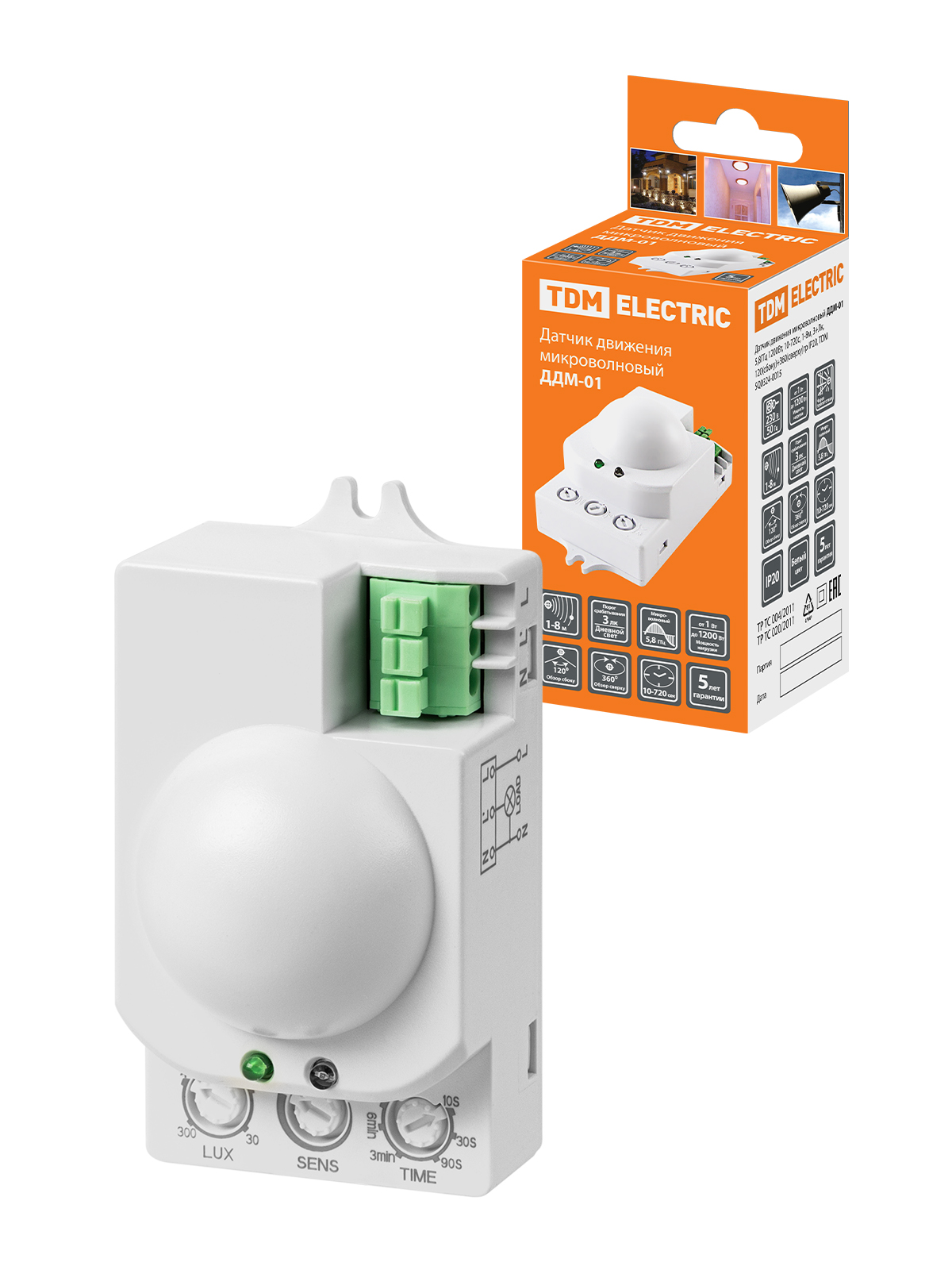 Наименование: Датчик движения микров. ДДМ-01 5,8ГГц 1200Вт, 10-720с, 1-8м, 3+Лк, 120(сб)+360(св)гр IP20, TDM