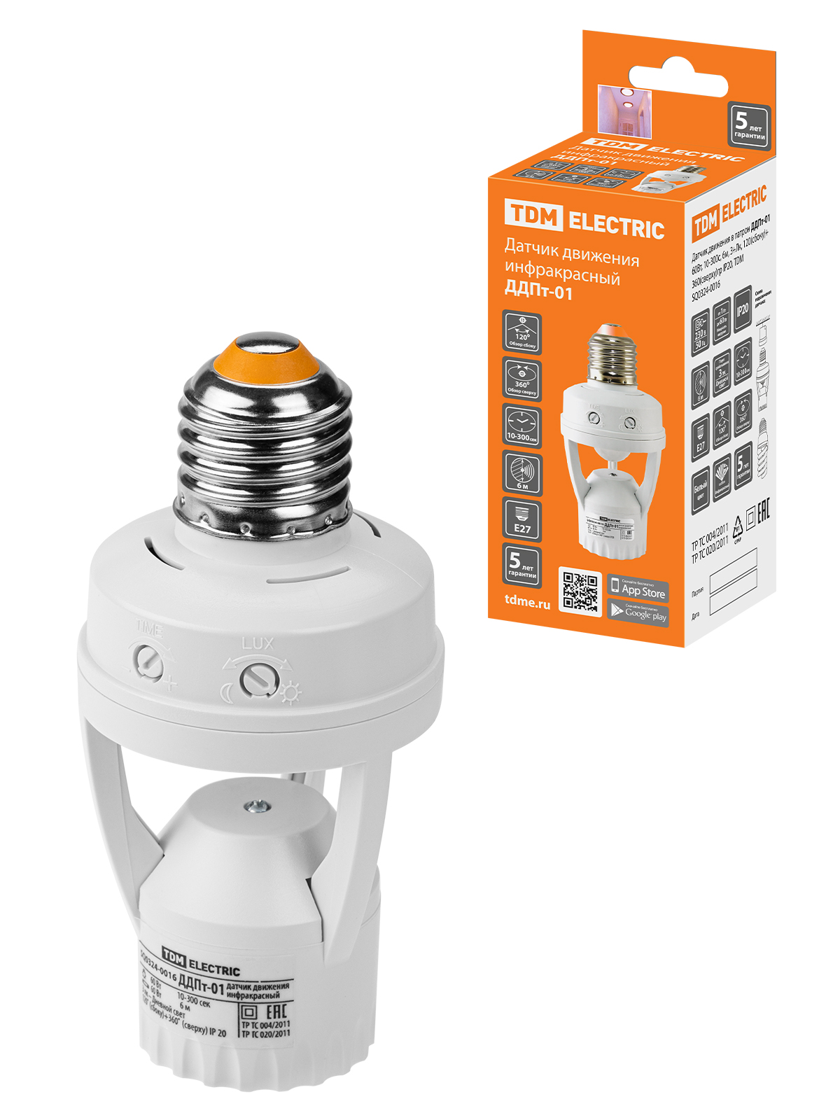 Наименование: Датчик движения патрон ДДПт-01 60Вт, 10-300с, 6м, 3+Лк, 120(сбоку)+360(сверху)гр IP20, TDM