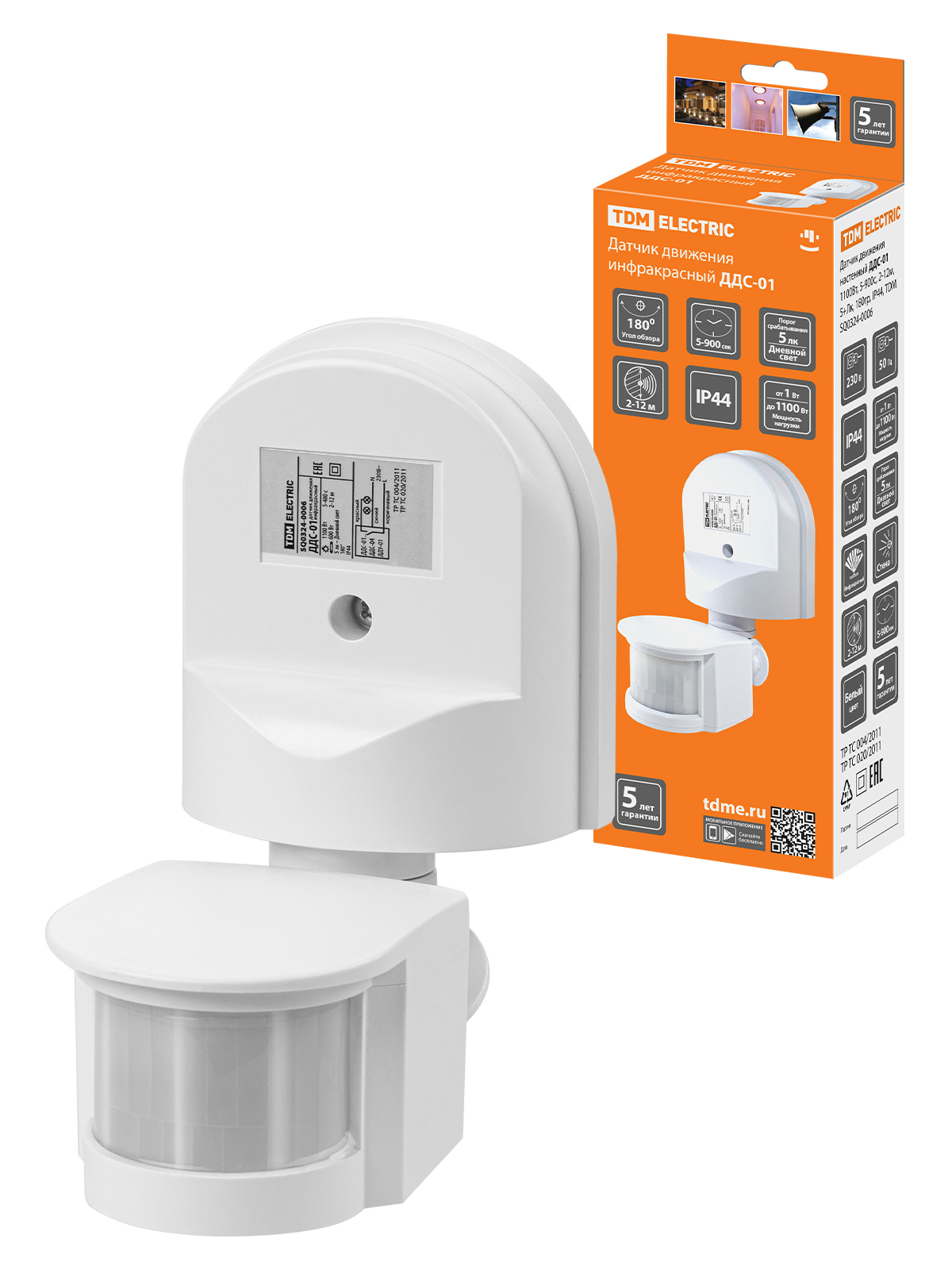 Наименование: Датчик движения стена ДДС-01 1100Вт, 5-900с, 2-12м, 5+Лк, 180гр, IP44, TDM