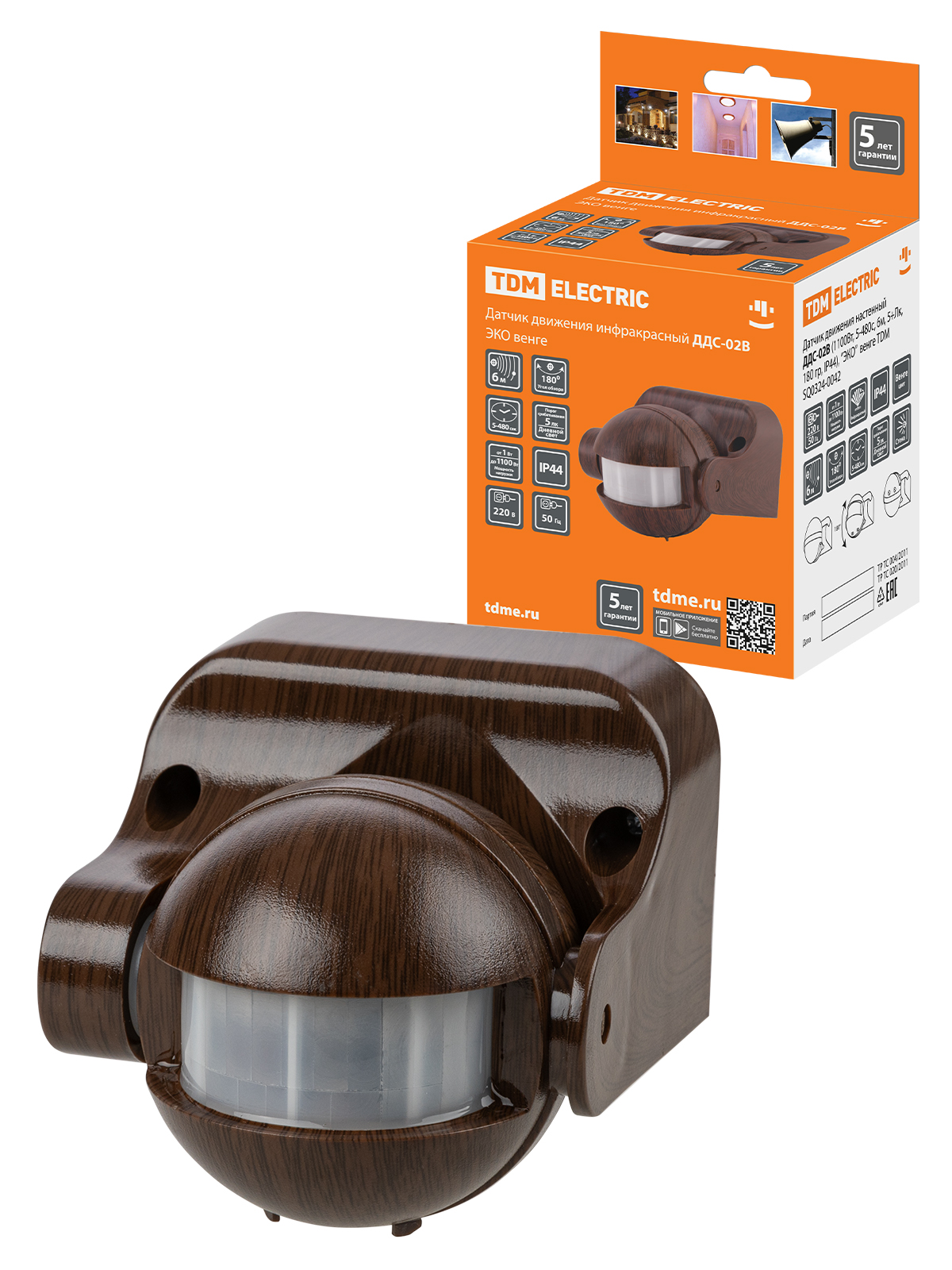 Наименование: Датчик движения стена ДДС-02В (1100Вт, 5-480с, 6м, 5+Лк, 180гр, IP44), "ЭКО" венге TDM