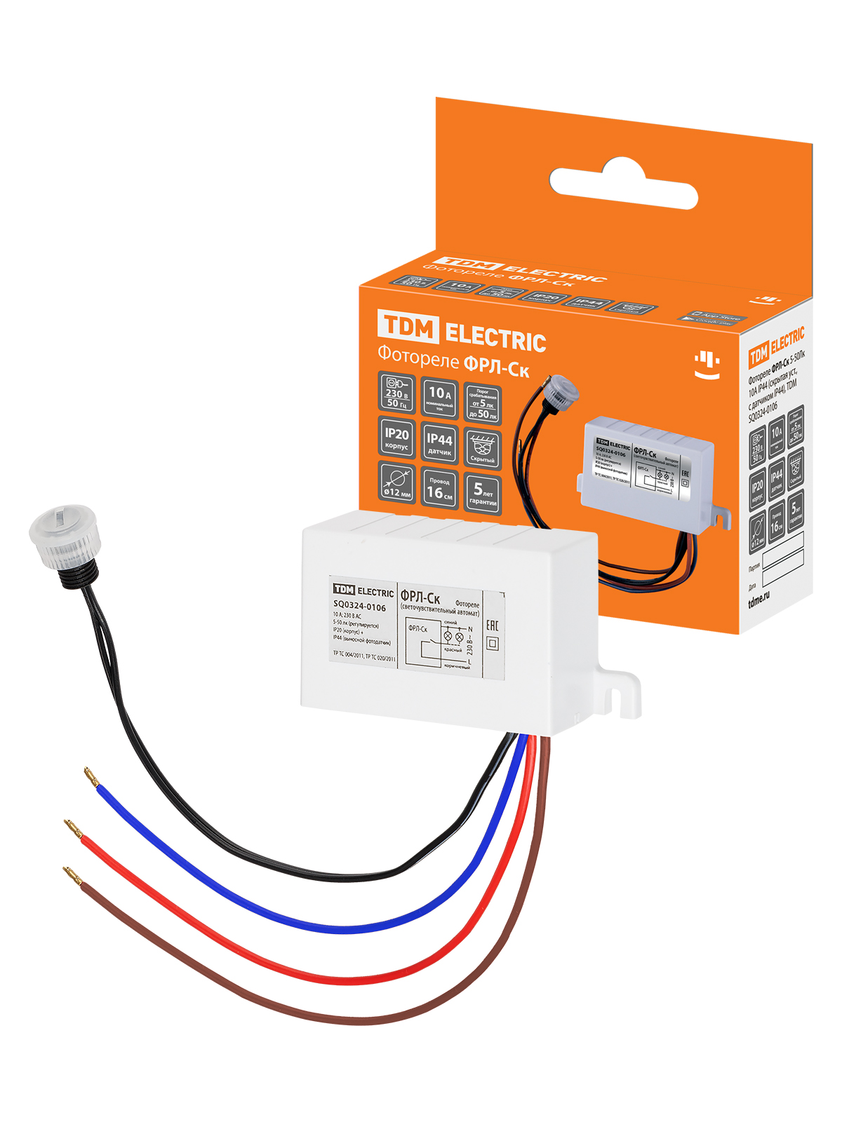 Наименование: Фотореле ФРЛ-Ск 5-50лк 10А IP44 (скрытая уст., с датчиком IP44), TDM