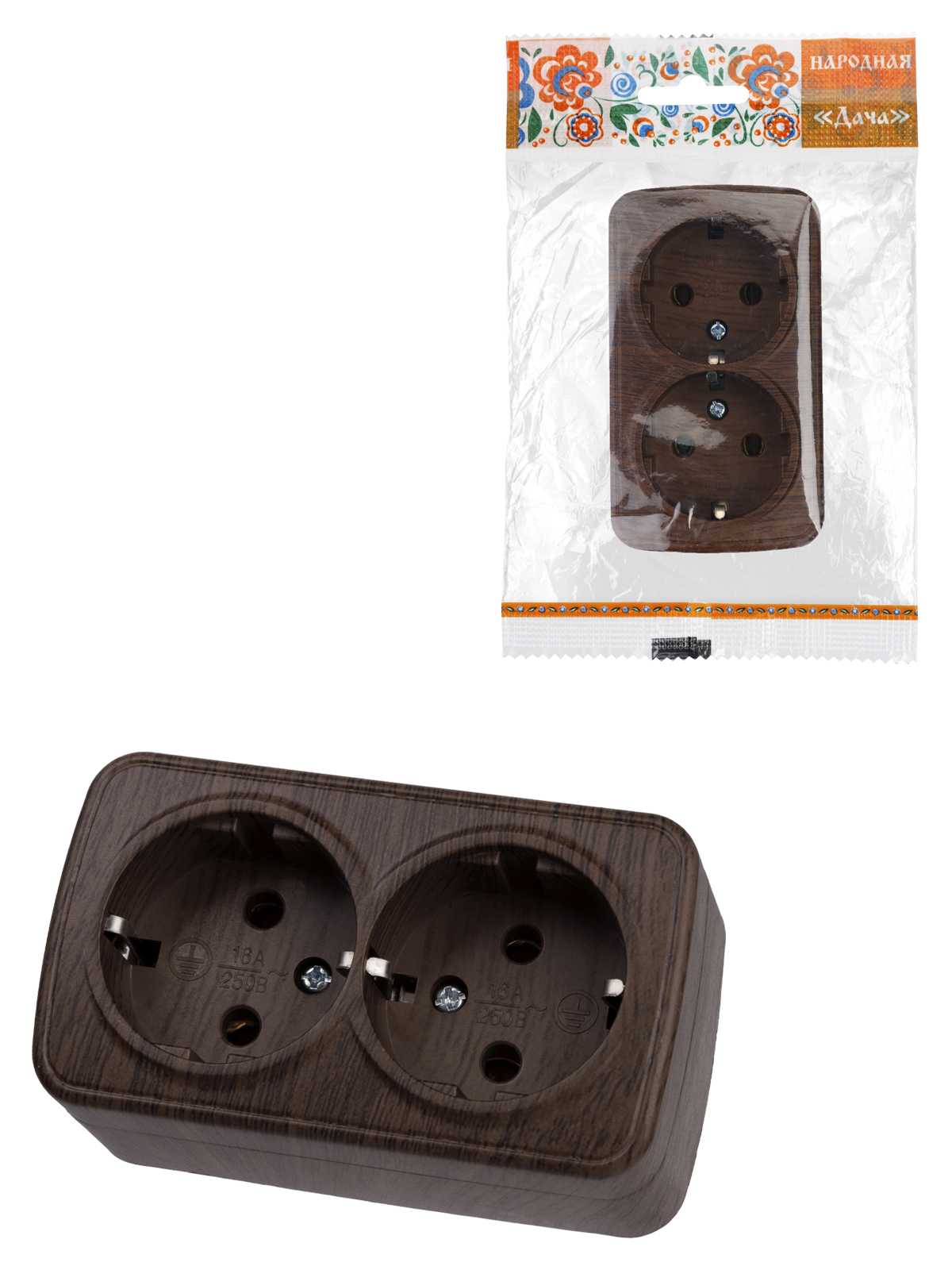 Наименование: Розетка двойная 2П+3 открытой установки IP20 16А, венге "Дача" Народная