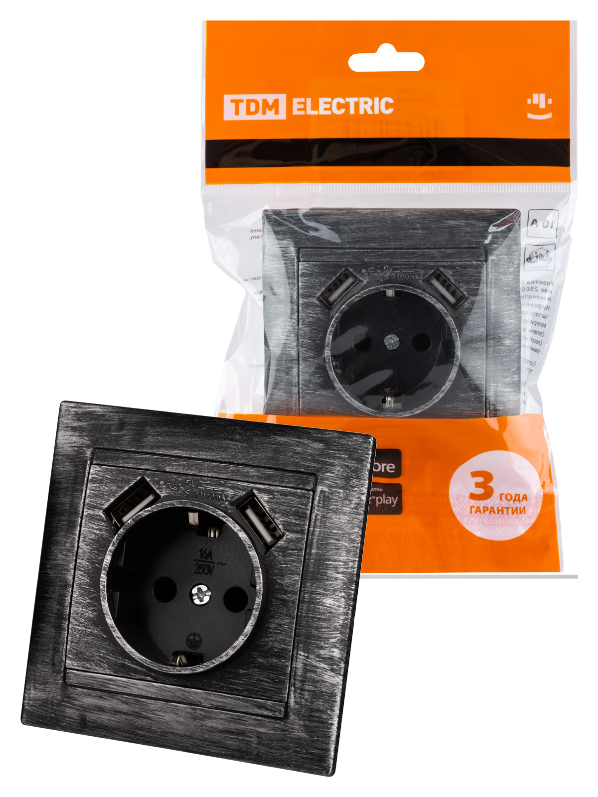 Наименование: Розетка 2П+З 16А 250В + 2 USB порта 2,1А 5В старинное серебро "Лама" TDM