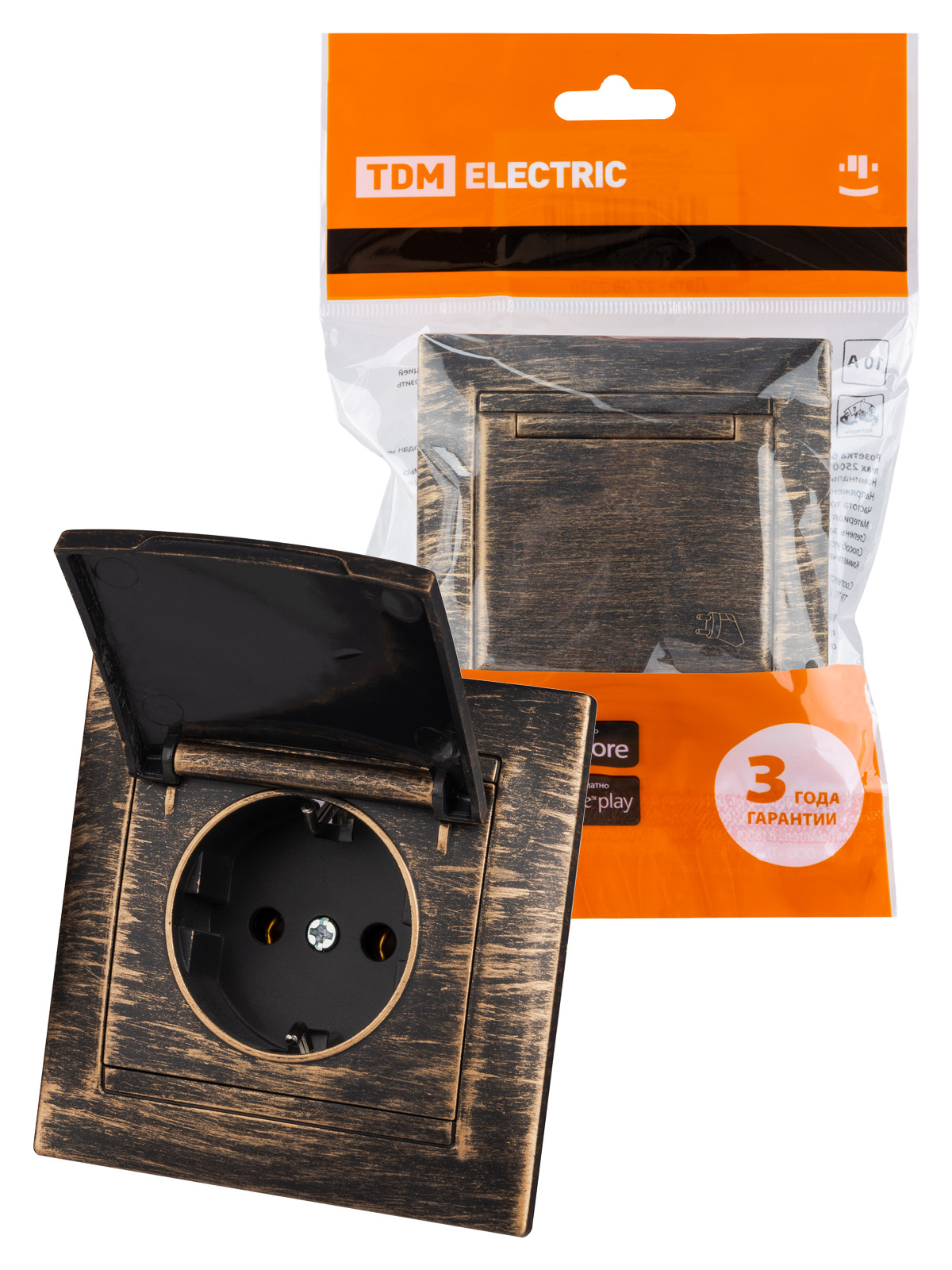 Наименование: Розетка 2П+З 16А 250В IP44 с крышкой старинная бронза "Лама" TDM