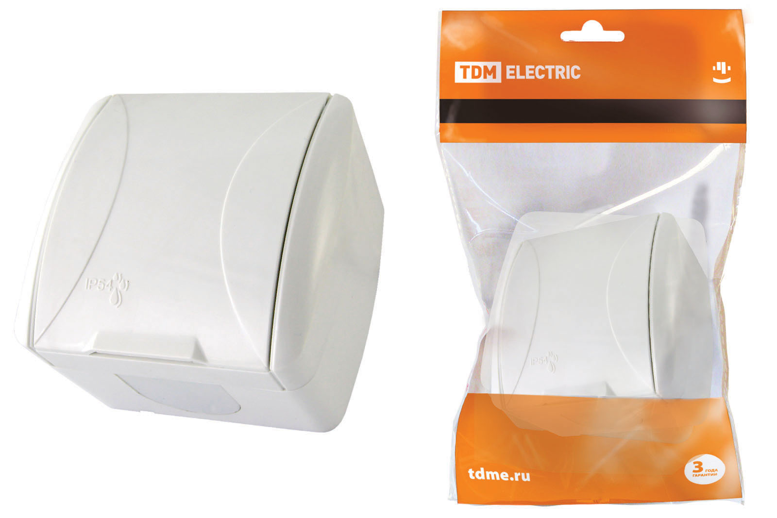 Наименование: Розетка 2П+З открытой установки IP54 16А с крышкой белая "Селигер" TDM