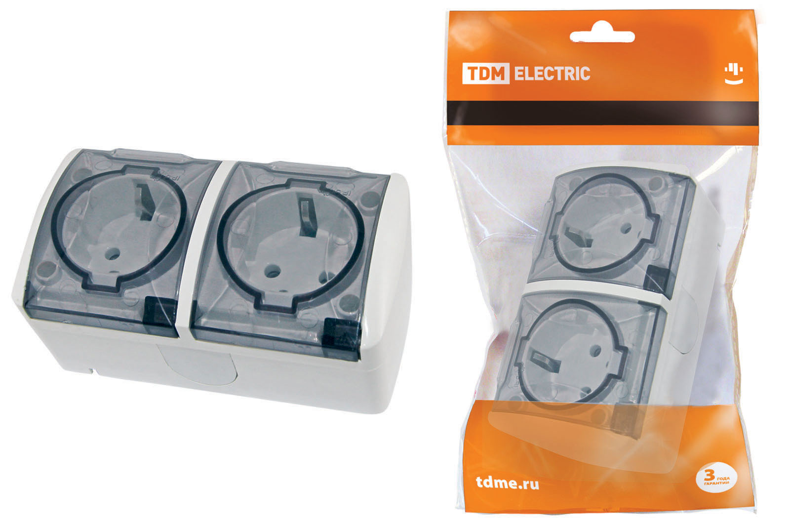 Наименование: Розетка двойная 2П+3 открытой установки IP54 16А с прозрачной крышкой белая "Селигер" TDM