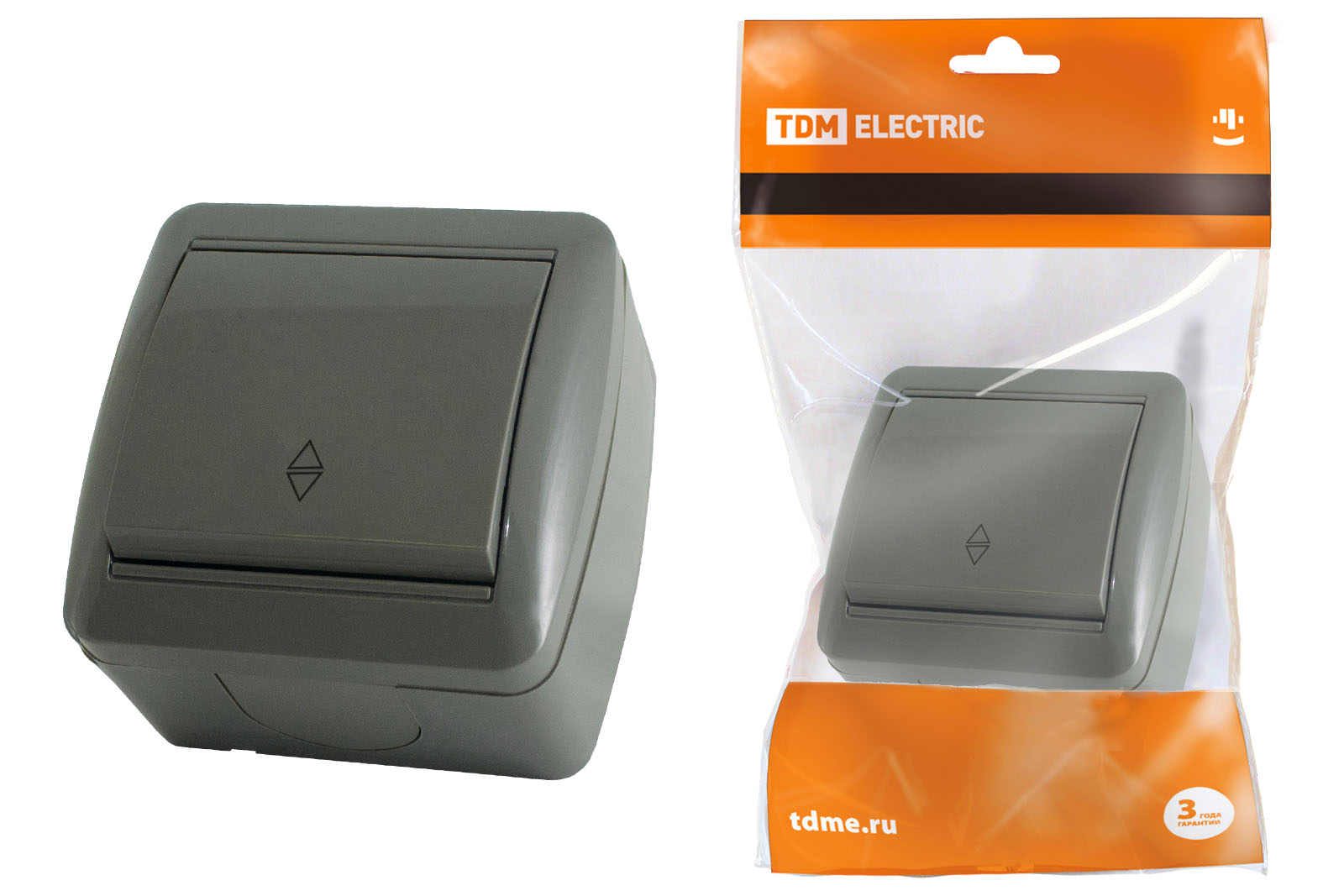 Наименование: Выключатель на 2 направления 1-кл. открытой установки IP44 10А серый "Селигер" TDM
