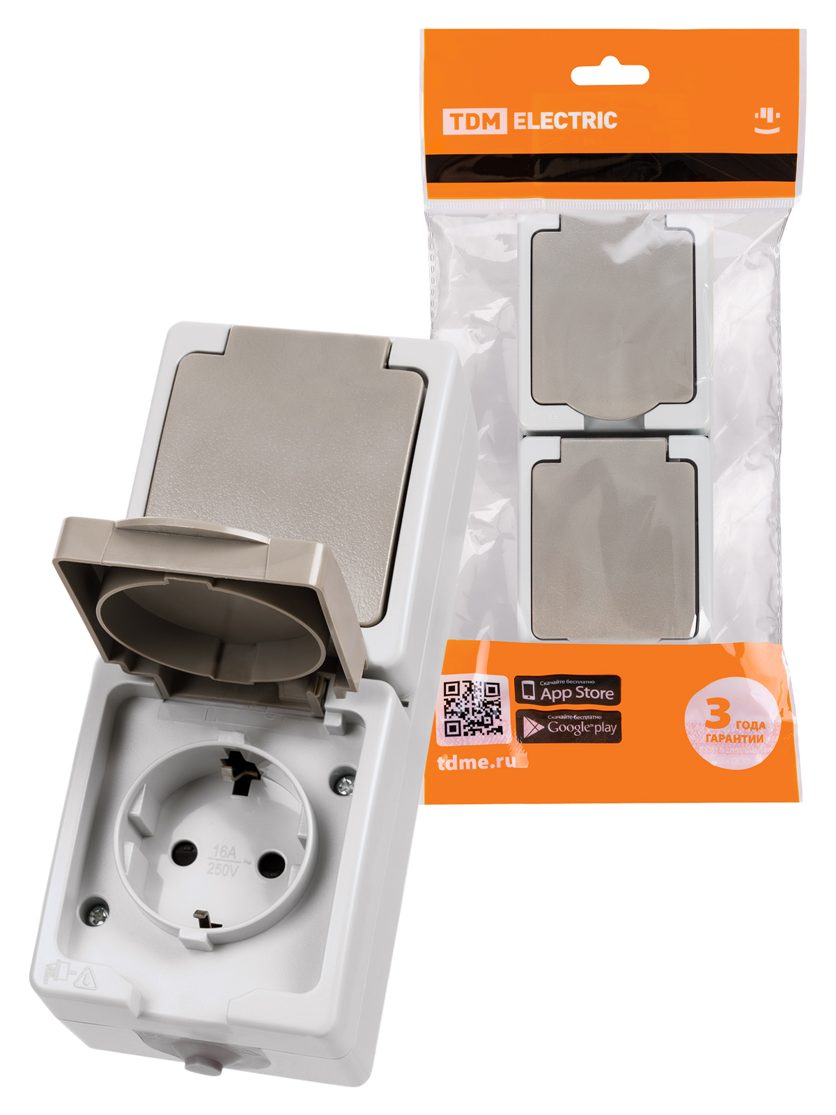 Наименование: Розетка двойная 2П+З (вертикальная) открытой установки IP54 16А серая "Вуокса" TDM
