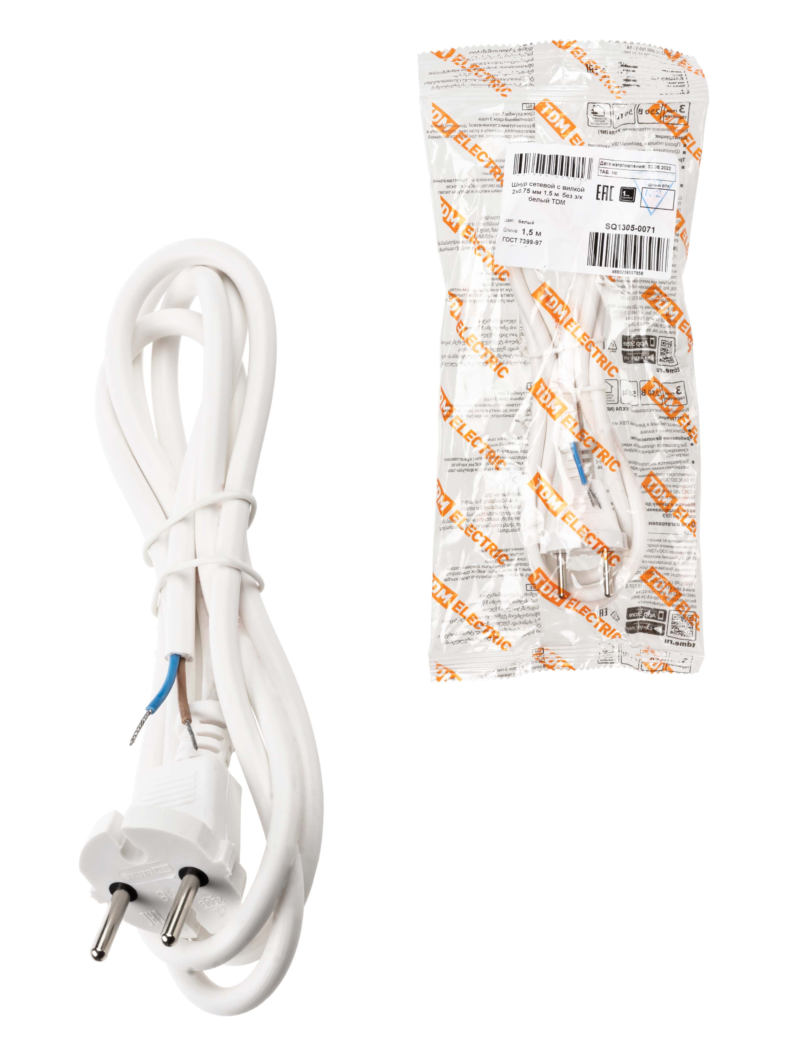 Наименование: Шнур сетевой с вилкой ПВС 2x0,75мм? 1,5м б/з белый TDM