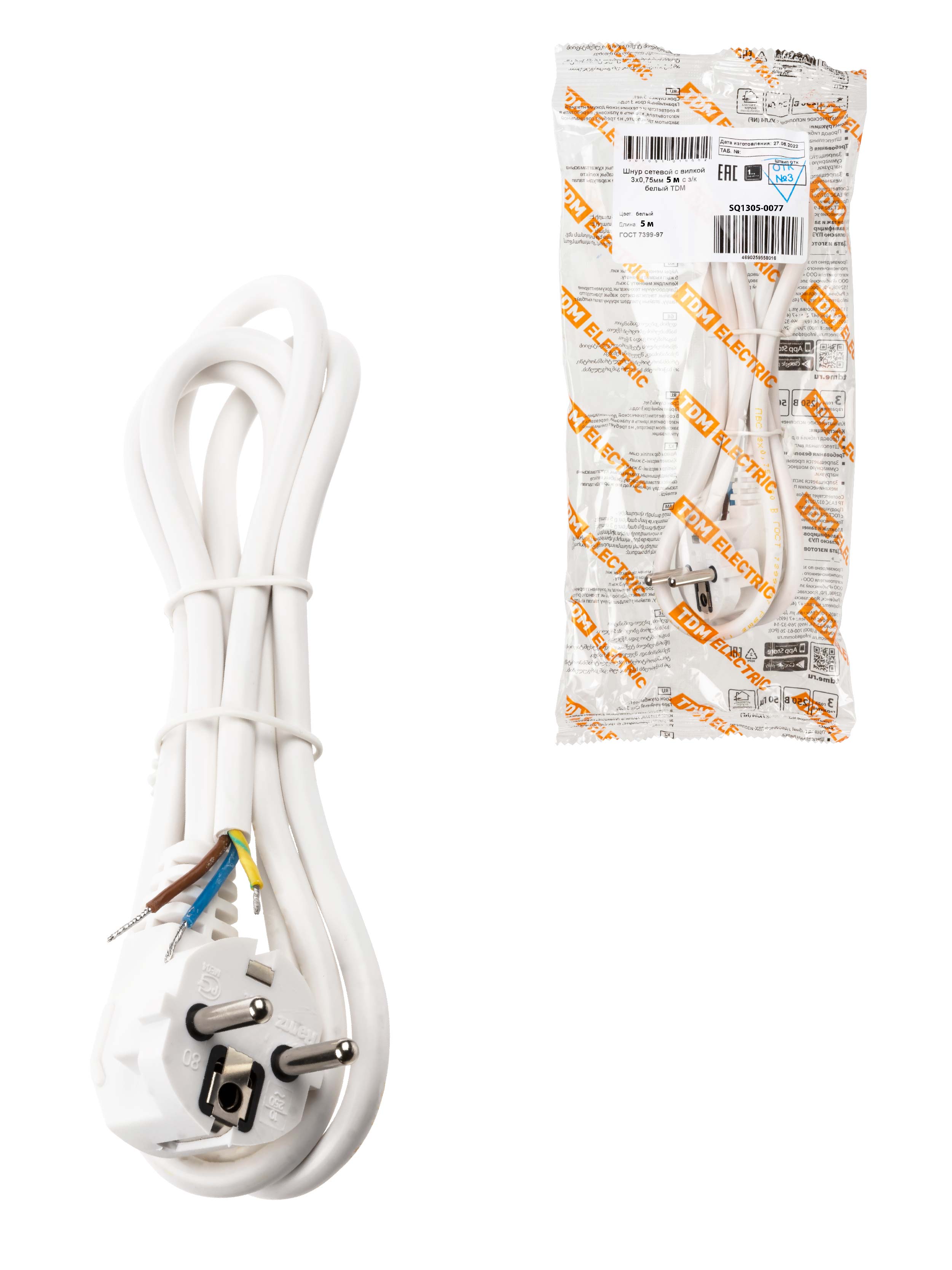 Наименование: Шнур сетевой с вилкой ПВС 3x0,75мм? 5м с/з белый TDM