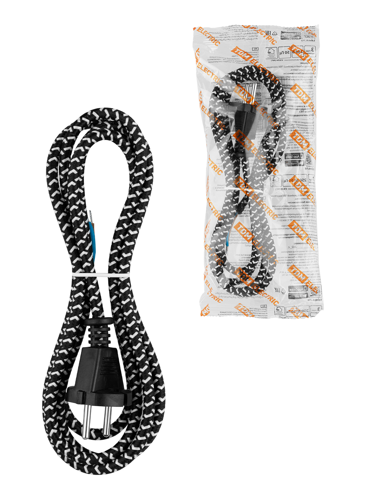 Наименование: Шнур сетевой с вилкой в тканевой оплетке ПВС 2x0,75мм2 1,8м, 1400 Вт б/з черный TDM