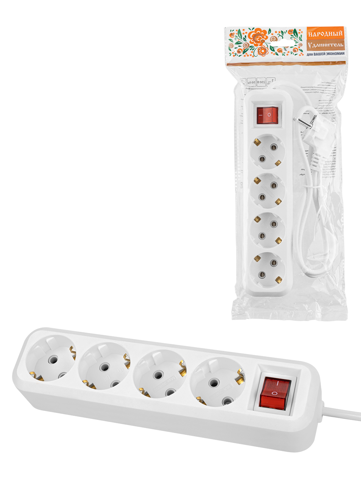 Наименование: Удлинитель 4 гнезда, 10 метров, с/з, выкл., 16 А, 3680 Вт, белый, НАРОДНЫЙ