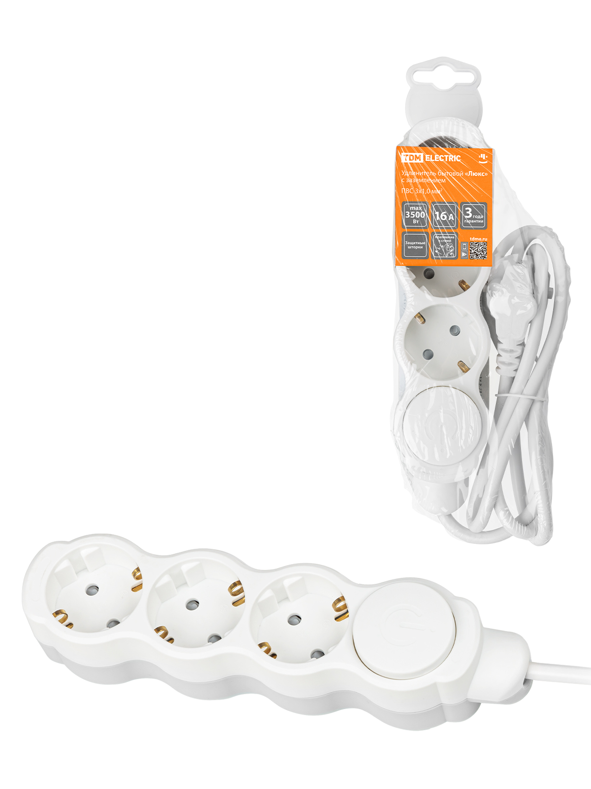 Наименование: Удлинитель бытовой "Люкс" УЛ03В выкл, 3 гнезда, 5м, с/з, с з/ш, ПВС 3х1мм2 16А/250В бело-серый TDM
