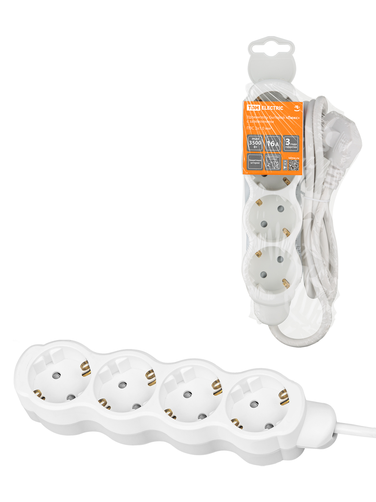 Наименование: Удлинитель бытовой "Люкс" УЛ04 4 гнезда, 1,5м, с/з, с з/ш, ПВС 3х1мм2 16А/250В бело-серый TDM