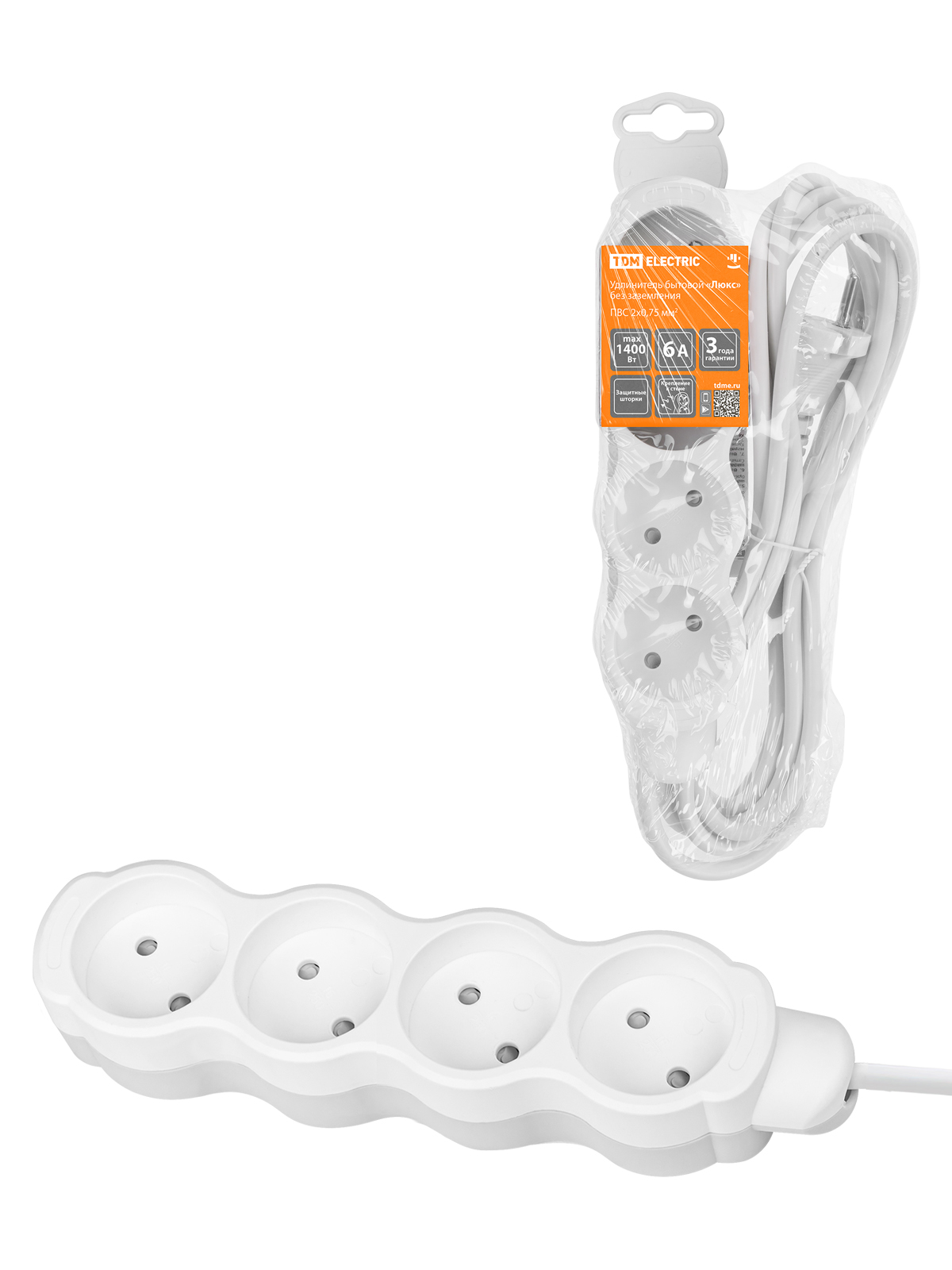 Наименование: Удлинитель бытовой "Люкс" УЛ4 4 гнезда, 5м, б/з, с з/ш, ПВС 2х0,75 мм2 10А/250В бело-серый TDM