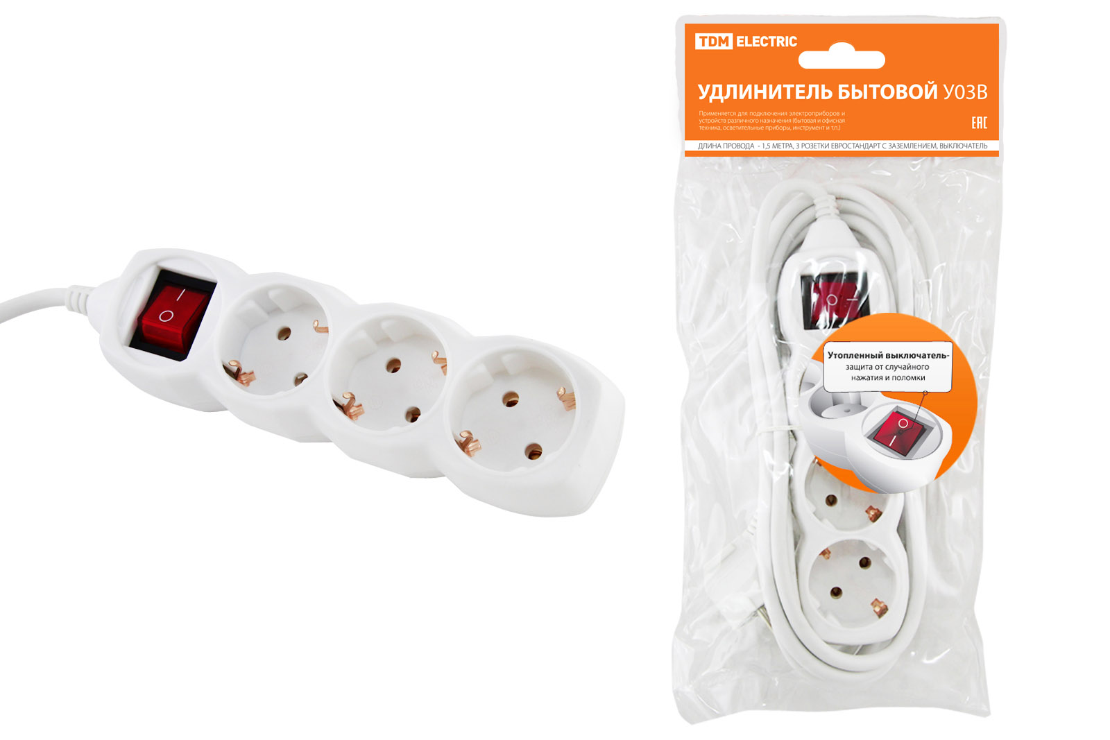 Наименование: Удлинитель бытовой У03В выключатель, 3 гнезда, 1,5метра, с заземлением, ПВС 3х1мм2 16А/250В TDM