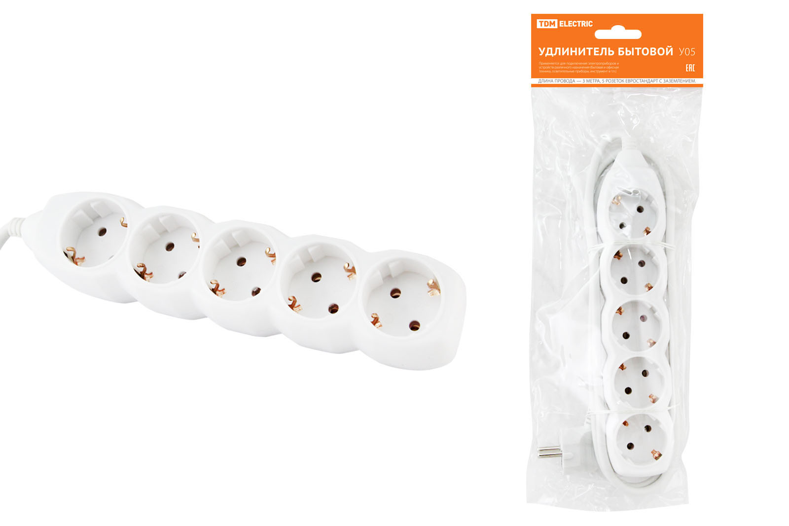 Наименование: Удлинитель бытовой У05 5 гнезд, 3метра, с заземлением, ПВС 3х1мм2 16А/250В TDM