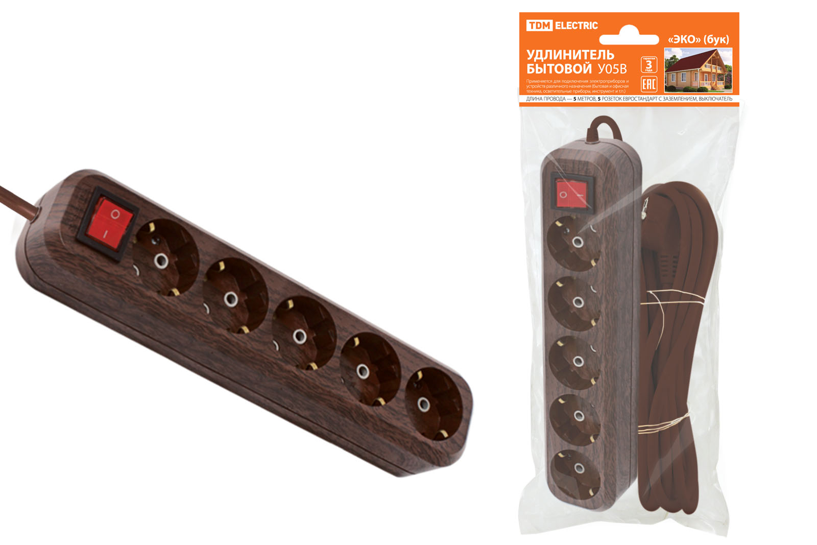 Наименование: Удлинитель бытовой У05В выключатель, 5 гнезд, 5метров,2П+3, ПВС 3х1мм2 "Эко" (бук) 16А/250В TDM