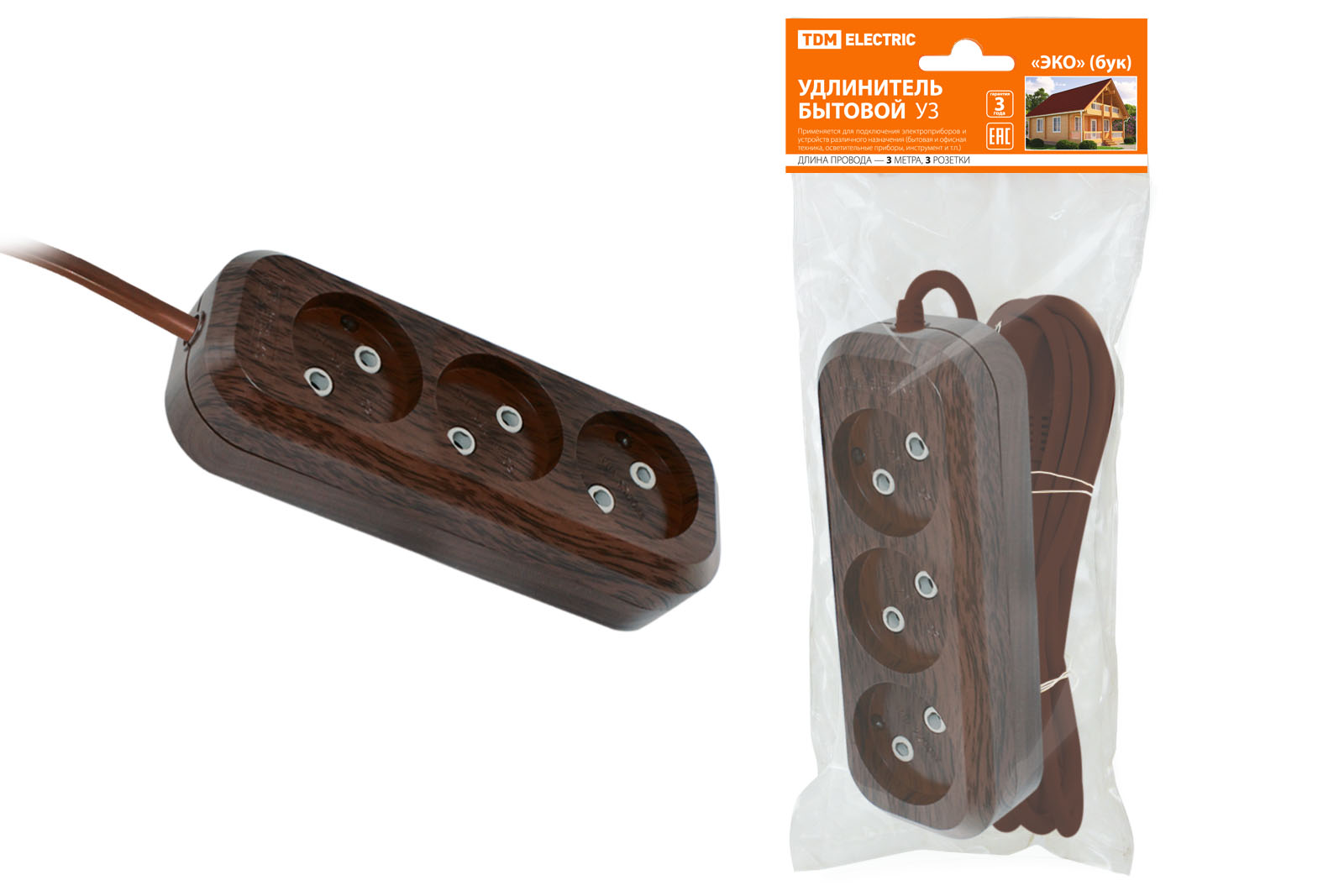 Наименование: Удлинитель бытовой У3 3 гнезда, 3метра,2П б/з, ПВС 2х0,75мм2 "Эко" (бук) 10А/250В TDM