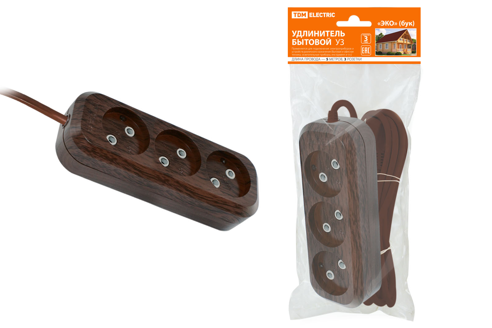 Удлинитель бытовой У3 3 гнезда, 5метров,2П б/з, ПВС 2х0,75мм2 "Эко" (бук) 10А/250В TDM