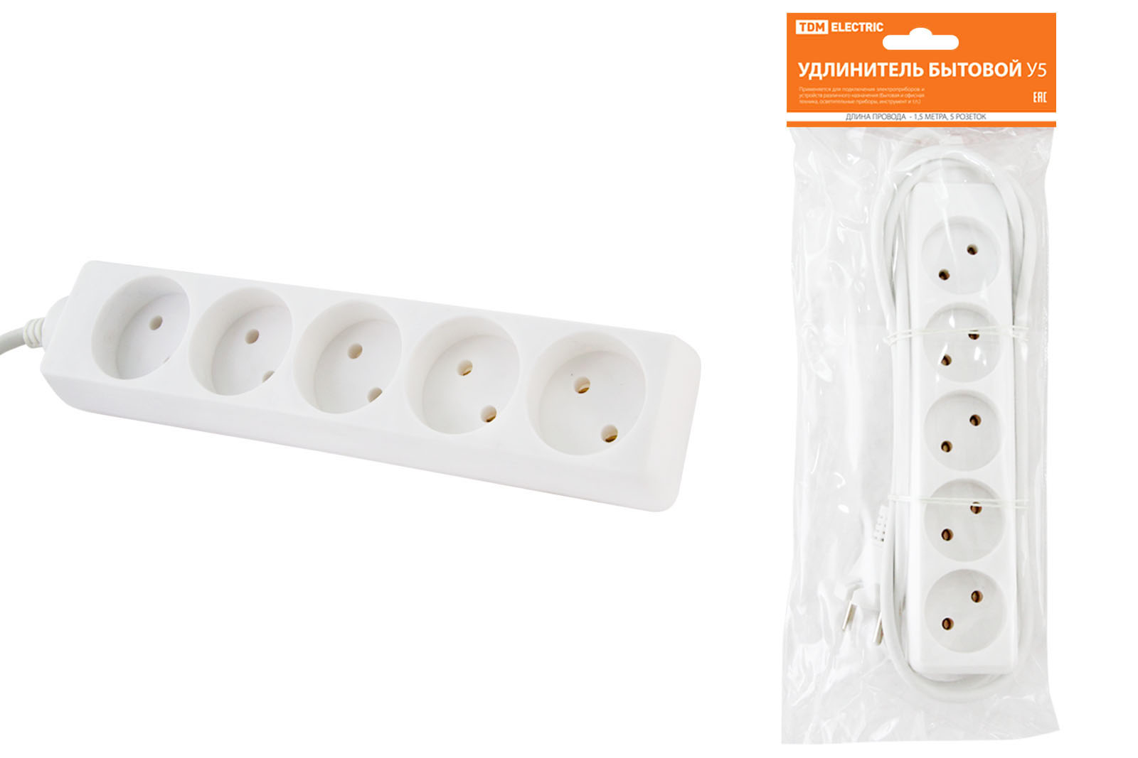 Наименование: Удлинитель бытовой У5 5 гнезд, 1,5метра, без заземления, ПВС 2х0,75мм2 10А/250В TDM