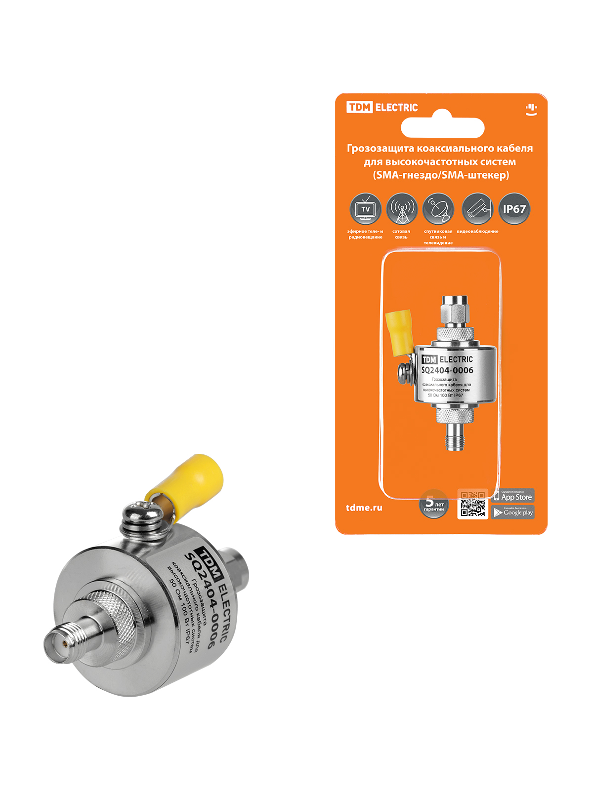 Наименование: Грозозащита коакс кабеля ВЧ систем, SMA-гнездо/SMA-штекер 50 Ом DC-6 ГГц 200Вт, с зазем, IP67, TDM