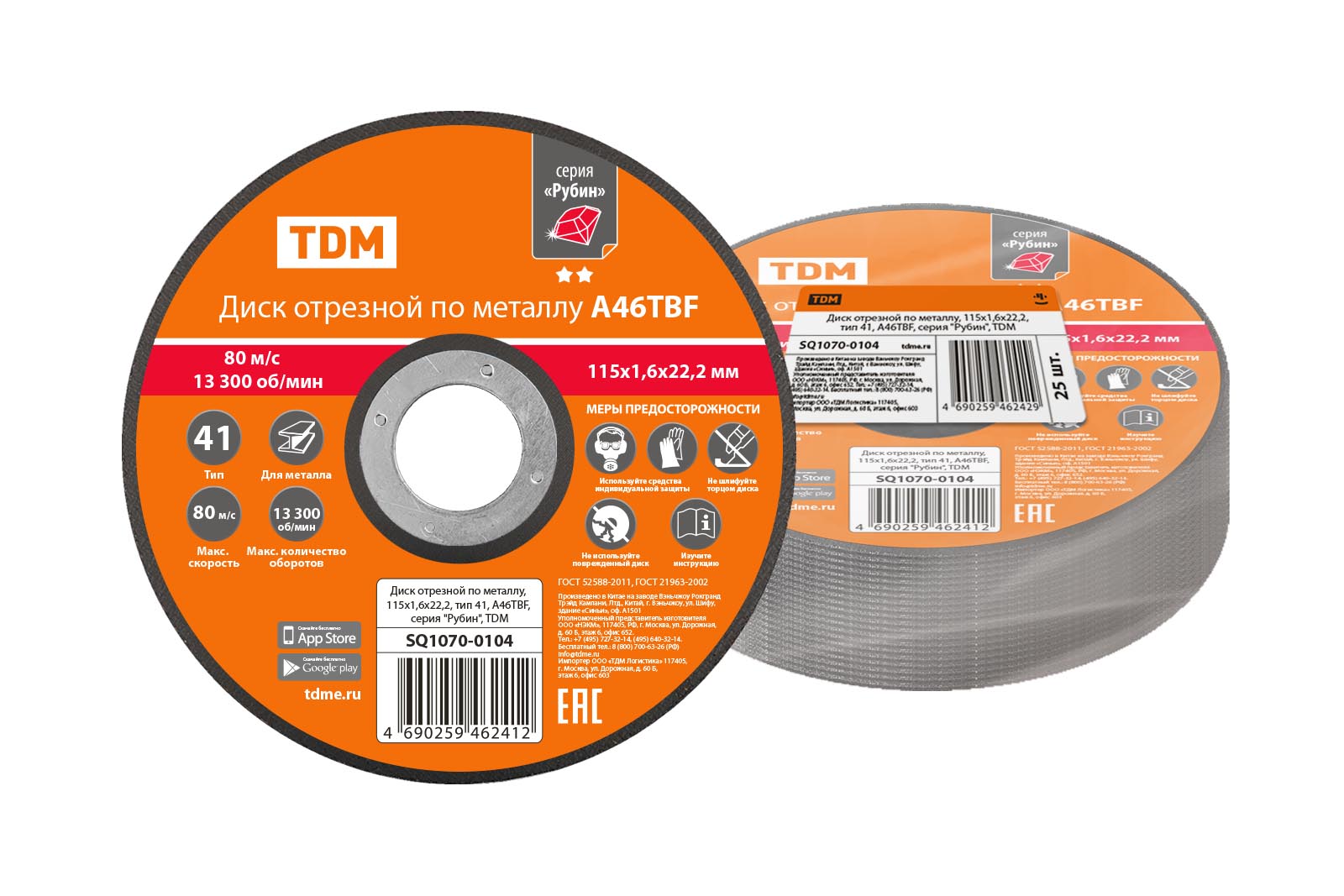 Наименование: Диск отрезной по металлу, 115х1,6х22,2, тип 41, A46TBF, серия "Рубин", TDM