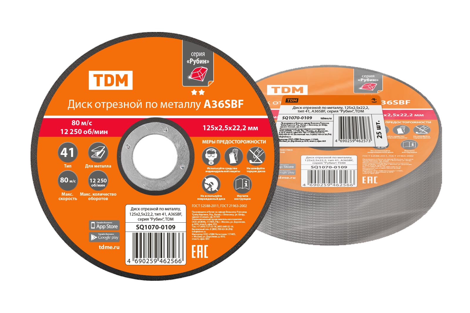 Наименование: Диск отрезной по металлу, 125х2,5х22,2, тип 41, A36SBF, серия "Рубин", TDM