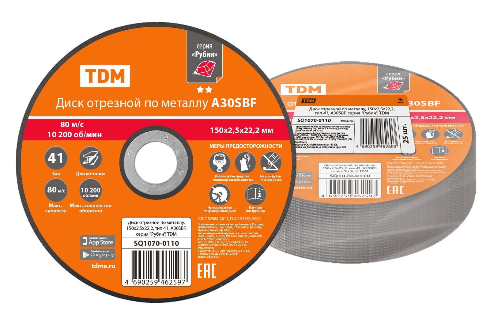 Наименование: Диск отрезной по металлу, 150х2,5х22,2, тип 41, A30SBF, серия "Рубин", TDM