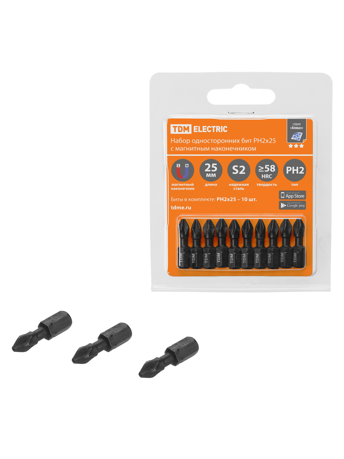 Наименование: Набор бит PH2x25, односторонних, сталь S2, Е 1/4", намагниченные, торсионные, 10 шт., «Алмаз» TDM