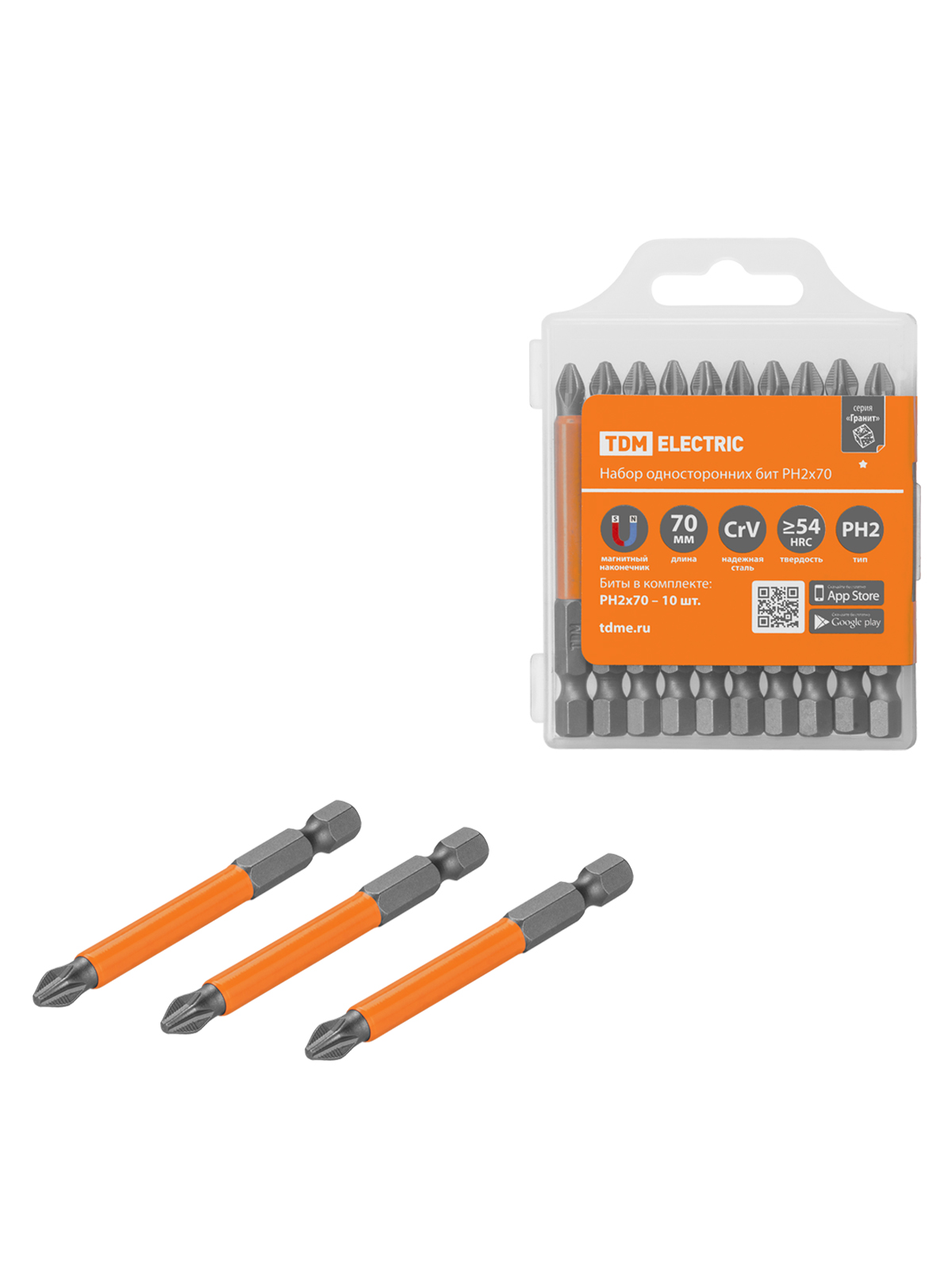 Наименование: Набор бит PH2x70, односторонних, сталь CrV, Е 1/4", 10 шт., «Гранит» TDM