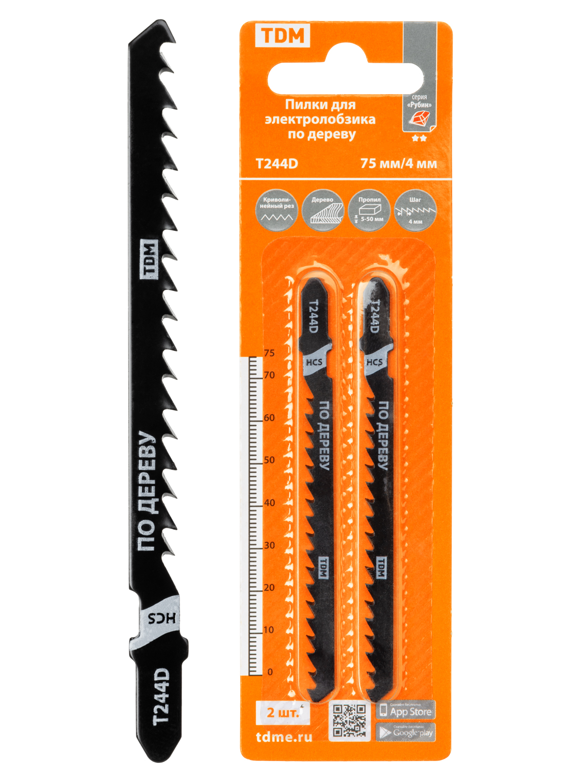 Наименование: Пилки для электролобзика по дереву, HCS, 75х4 мм, криволинейный рез, T244D, 2 шт, "Рубин", TDM