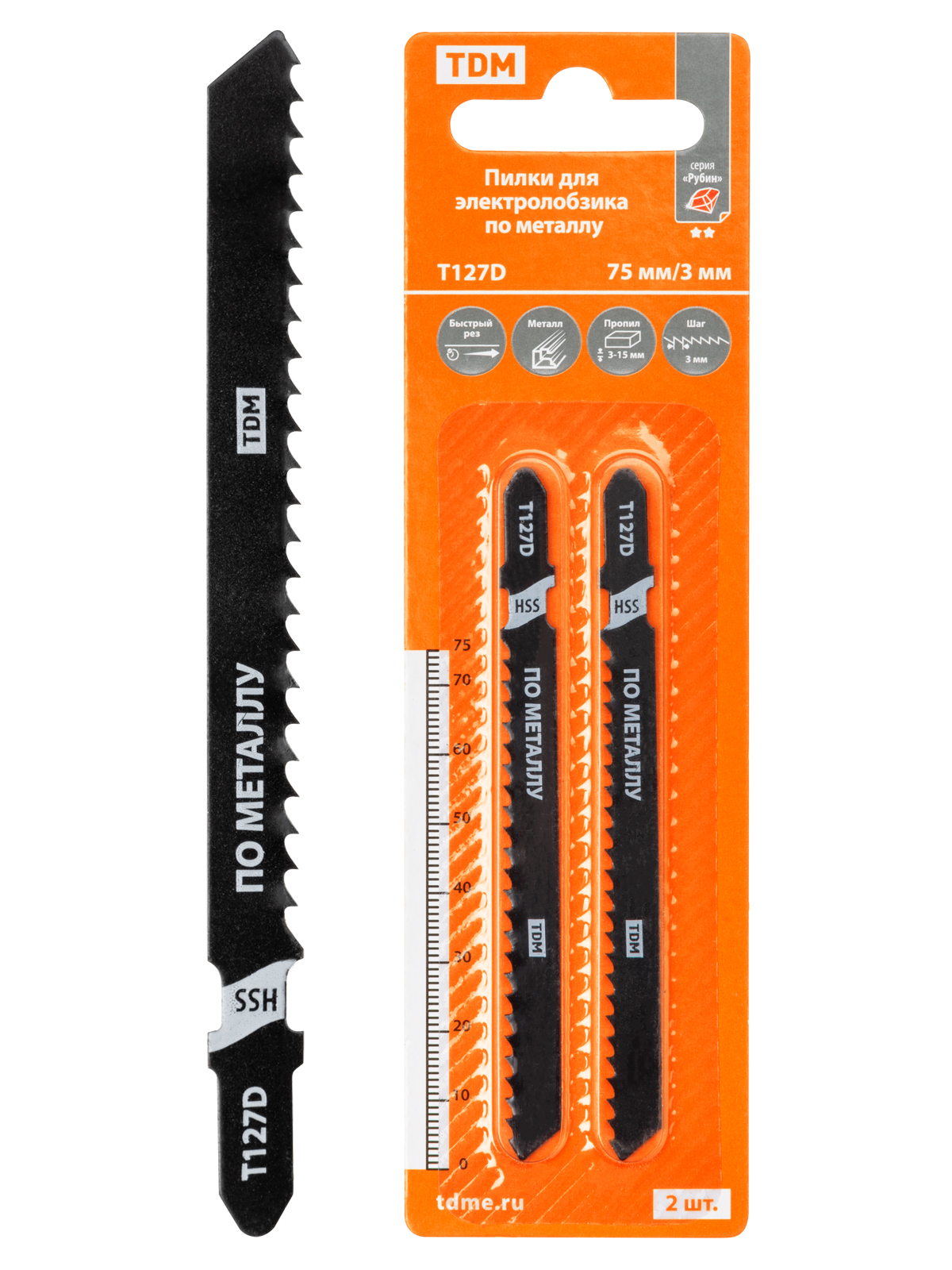 Наименование: Пилки для электролобзика по металлу, HSS, 75х3 мм, быстрый рез, T127D, 2 шт, "Рубин", TDM