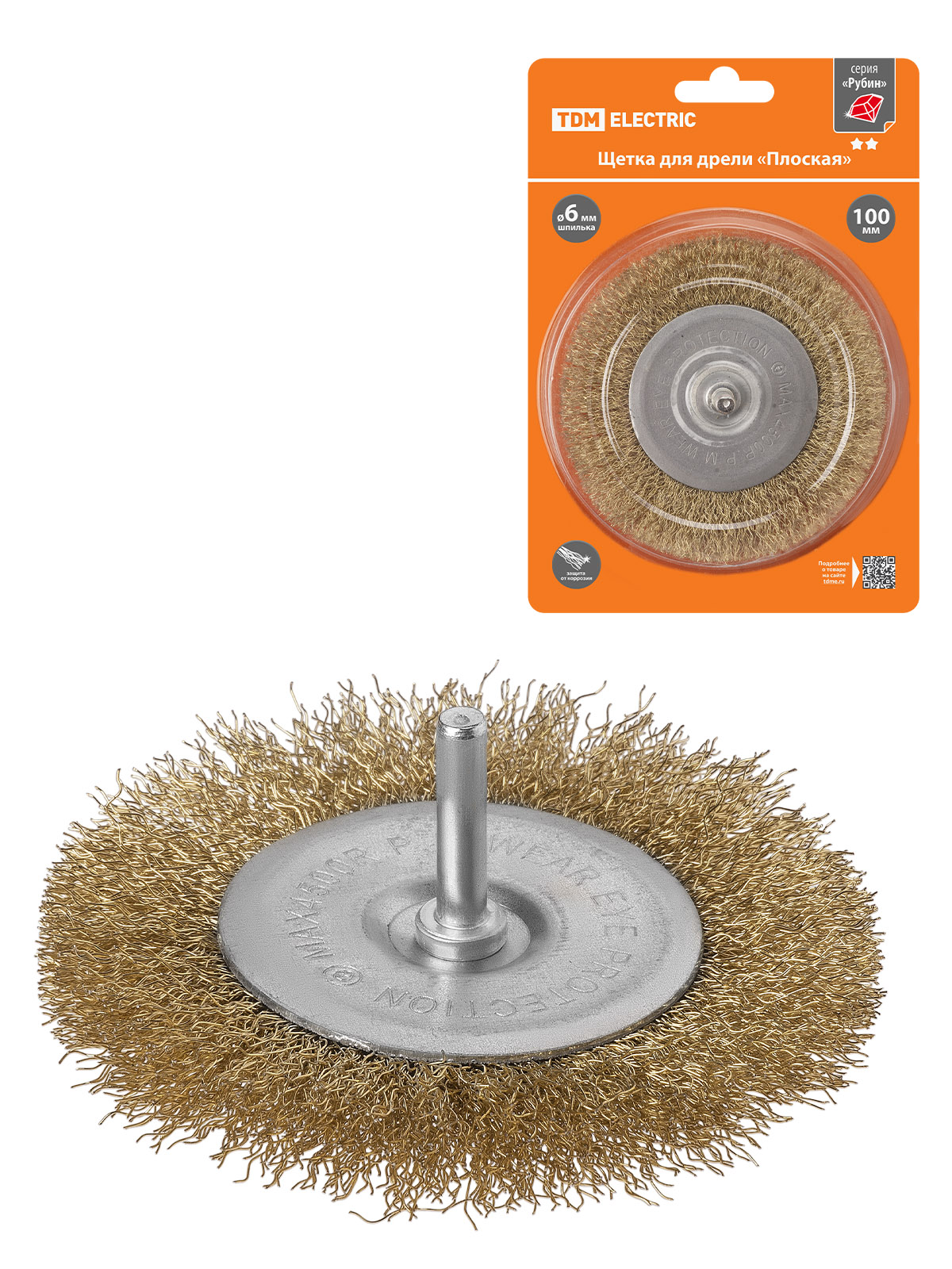 Наименование: Щетка для дрели "плоская", 100 мм, латунированная витая проволока d 0,3 мм, "Рубин", TDM