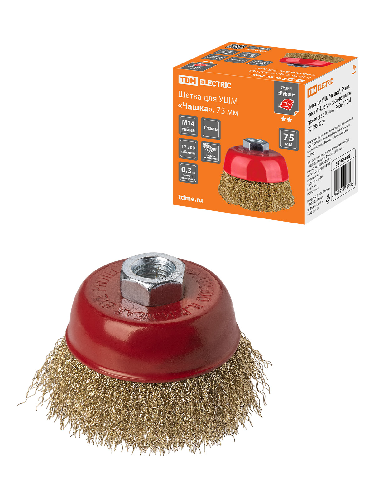 Наименование: Щетка для УШМ "чашка", 75 мм, гайка М14, латунированная витая проволока d 0,3 мм, "Рубин", TDM