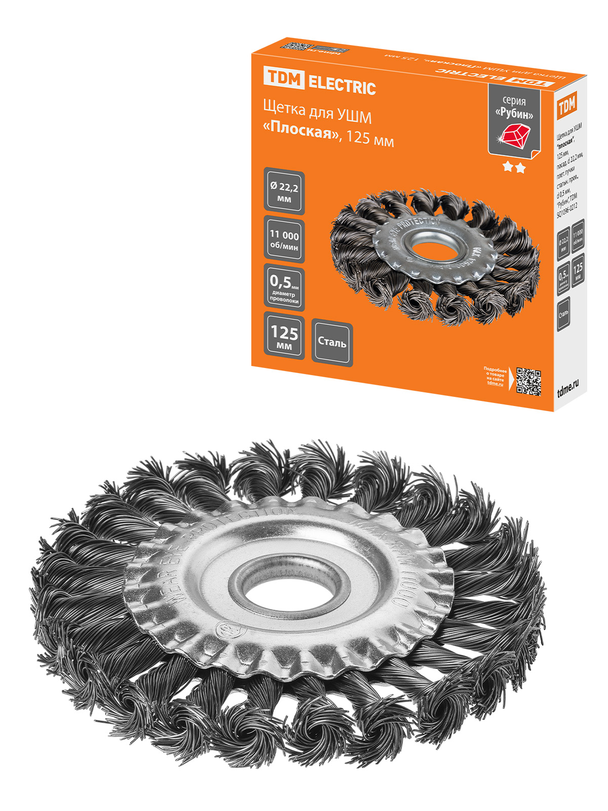 Наименование: Щетка для УШМ "плоская", 125 мм, посад. d 22,2 мм, плет. пучки стальн. пров., d 0,5 мм, "Рубин", TDM
