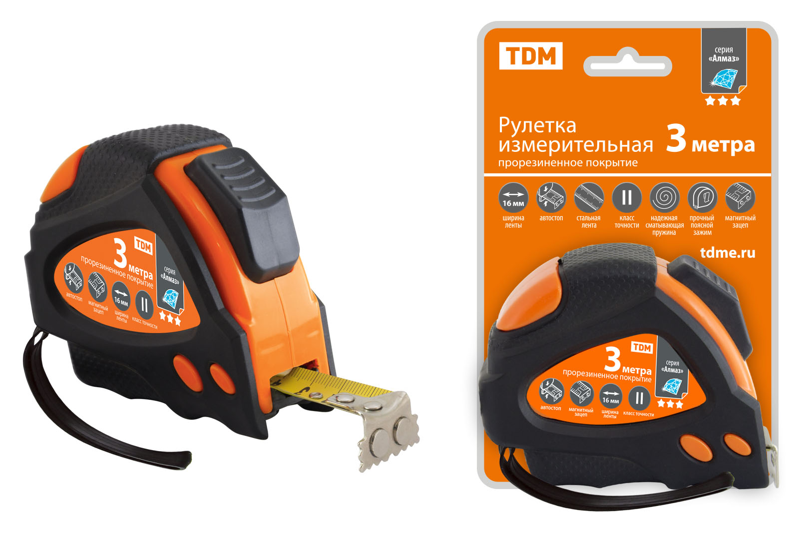 Наименование: Рулетка 3 м х 16 мм, тройная фиксация, автостоп, обрезиненный корпус, магнит, "Алмаз" TDM