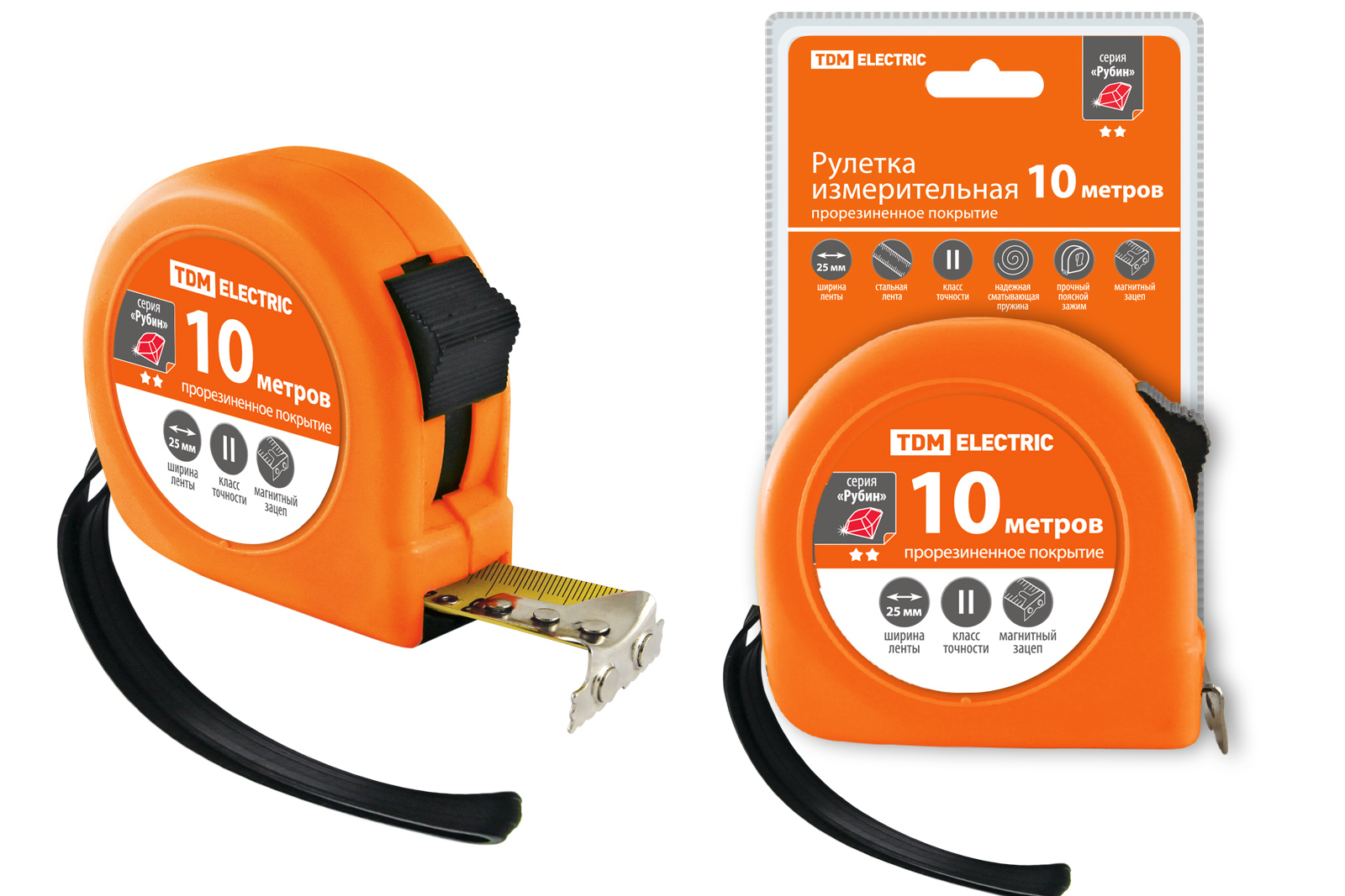 Наименование: Рулетка, длина 10 м, стальная лента, ширина 25 мм, прорезиненное покрытие, магнит, "Рубин" TDM