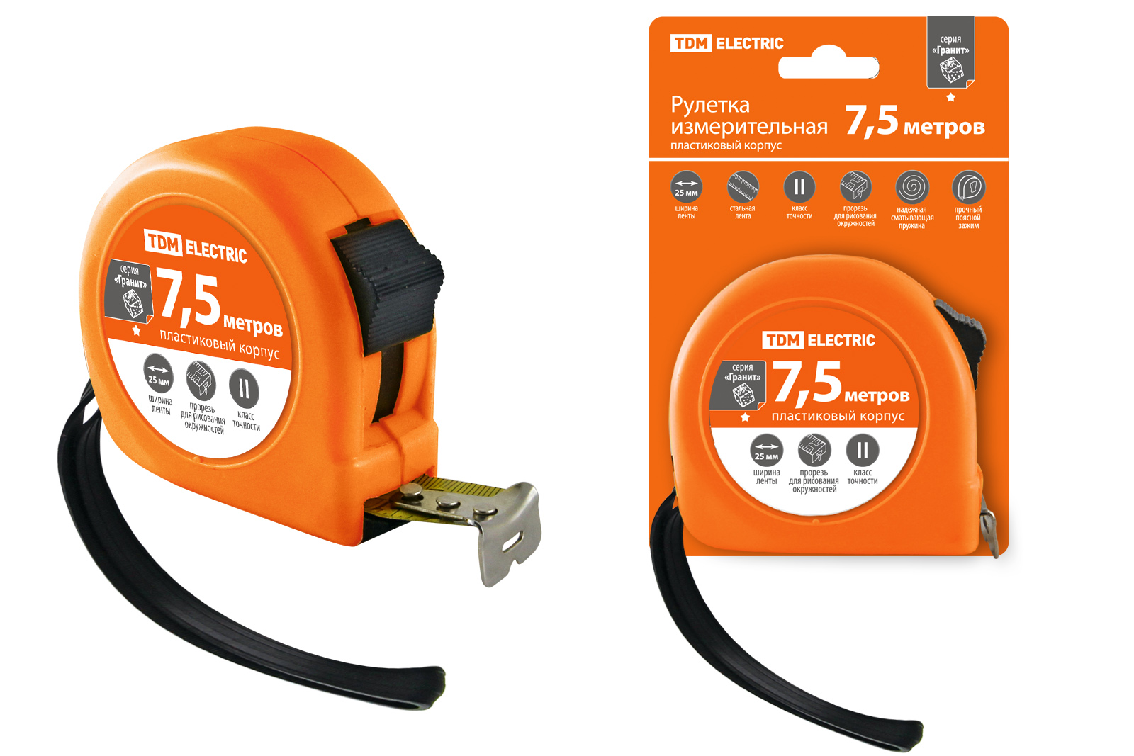 Наименование: Рулетка, длина 7.5 м, стальная лента, ширина 25 мм, пластиковый корпус, "Гранит" TDM