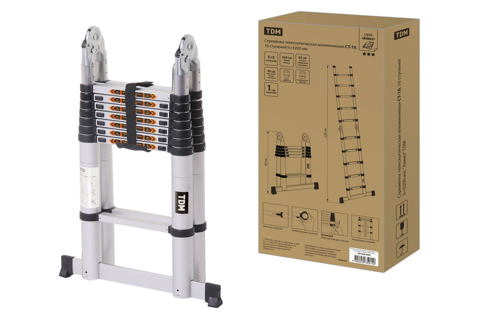 Наименование: Стремянка телескопическая алюминиевая СТ-10, 10 ступеней h=3200 мм, "Алмаз" TDM