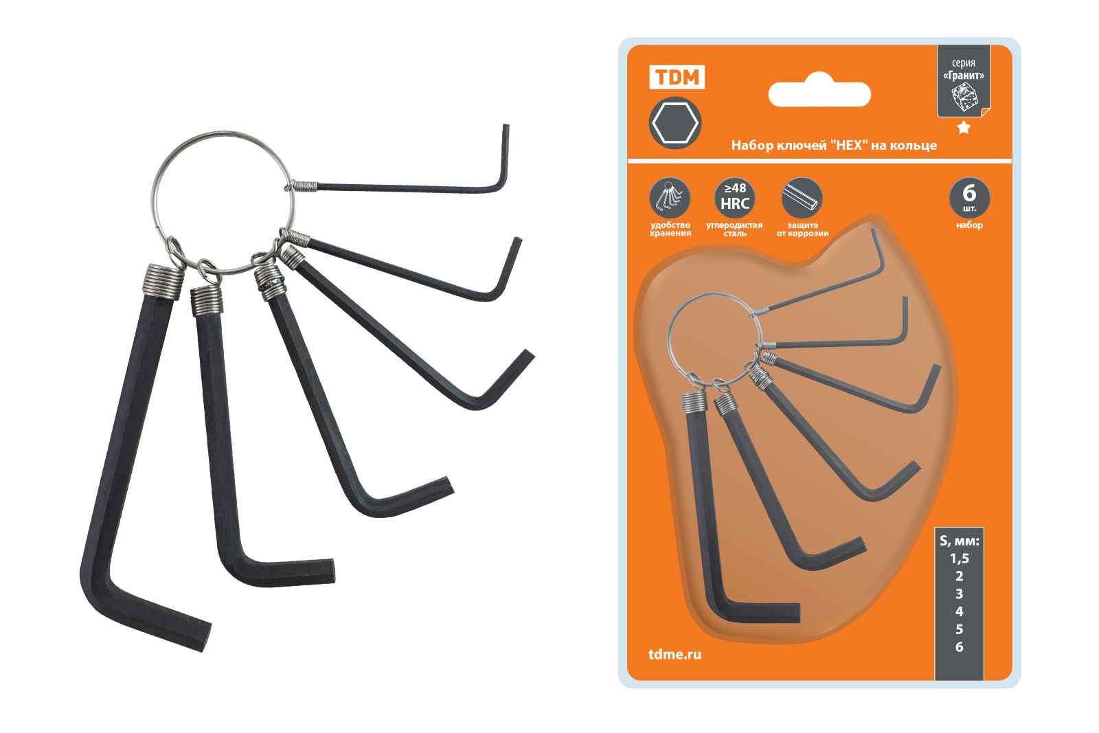 Набор ключей "HEX" на кольце 6 шт.: 1.5 - 6 мм, углеродистая сталь, блистер "Гранит" TDM
