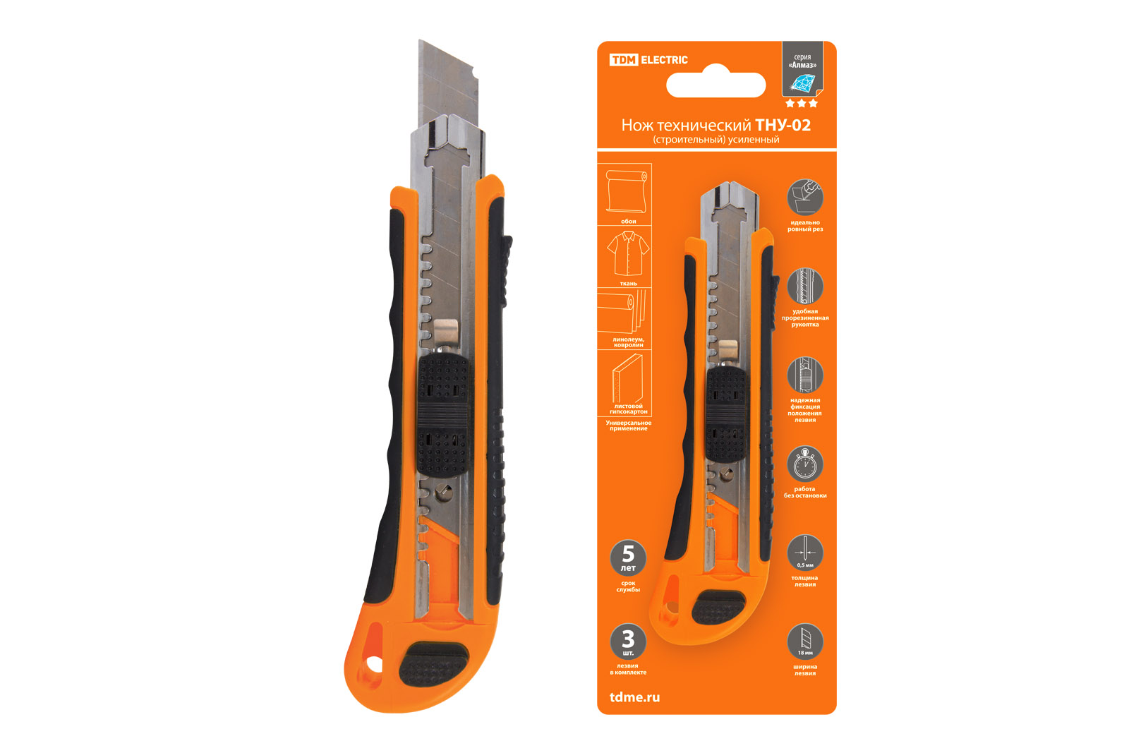 Наименование: Нож технический усиленный, ТНУ-02, 18 мм, 3 сегментированных лезвия, автосмена, серия "Алмаз" TDM