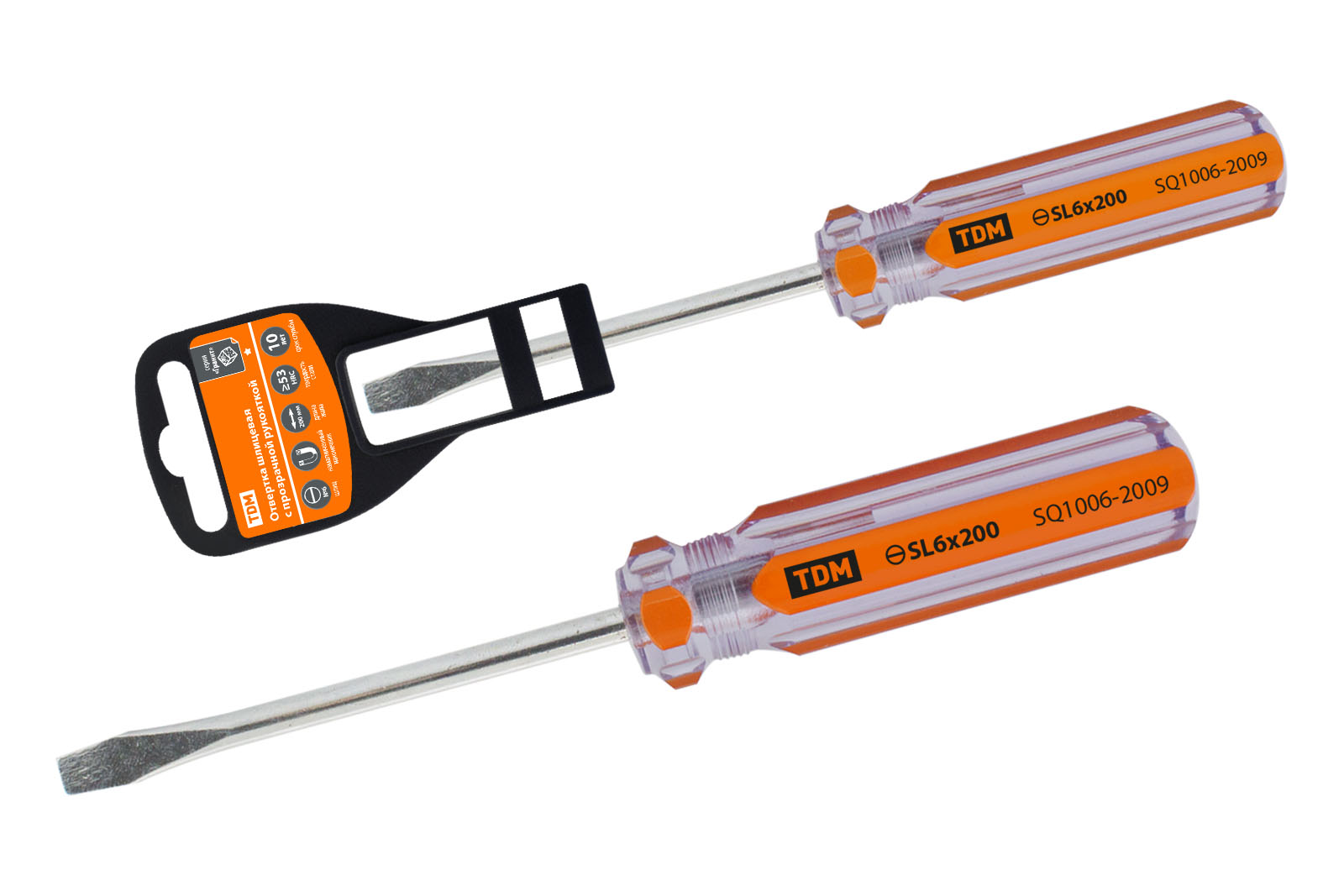 Наименование: Отвертка шлицевая, прозрачная рукоятка, углеродистая сталь, тип SL6.0 x 200 мм, серия "Гранит" TDM