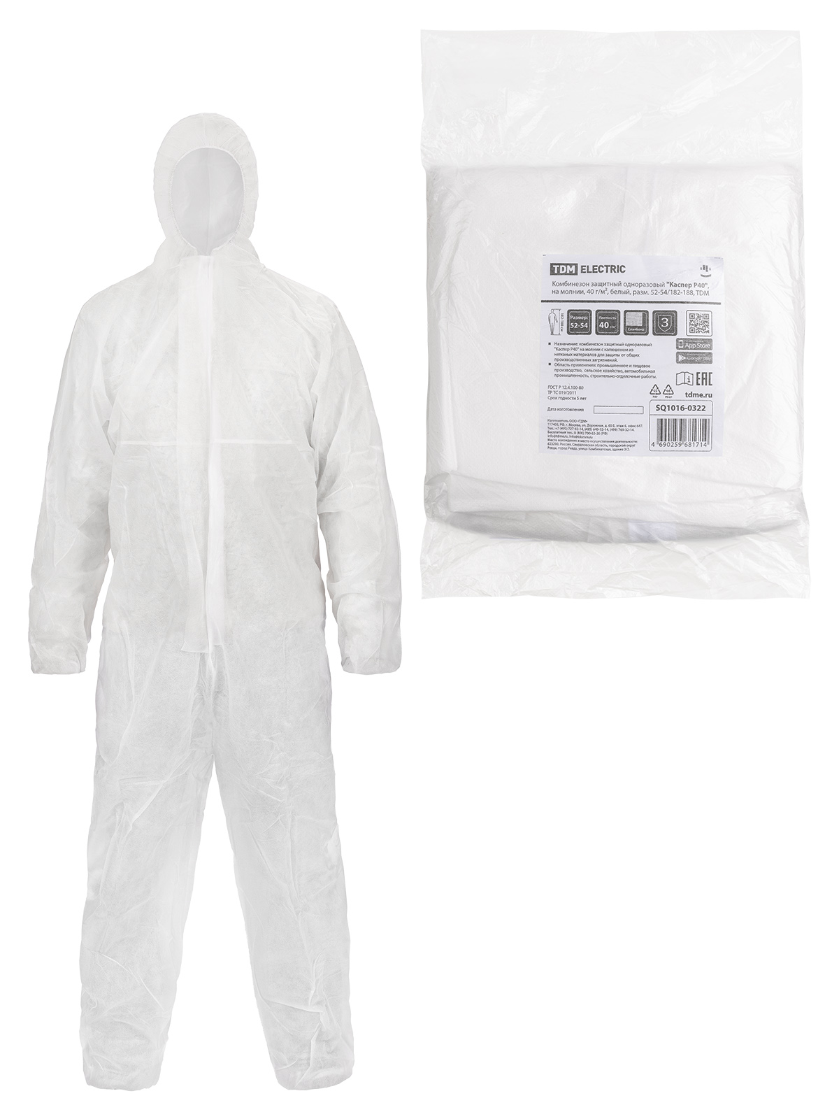 Наименование: Комбинезон защитный одноразовый "Каспер Р40", на молнии, 40 г/м2, белый, разм. 52-54/182-188, TDM