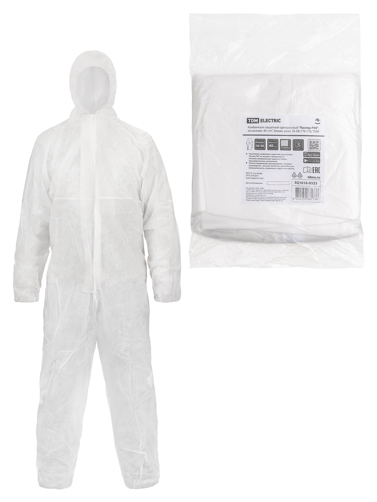 Наименование: Комбинезон защитный одноразовый "Каспер Р40", на молнии, 40 г/м2, белый, разм. 56-58/170-176, TDM