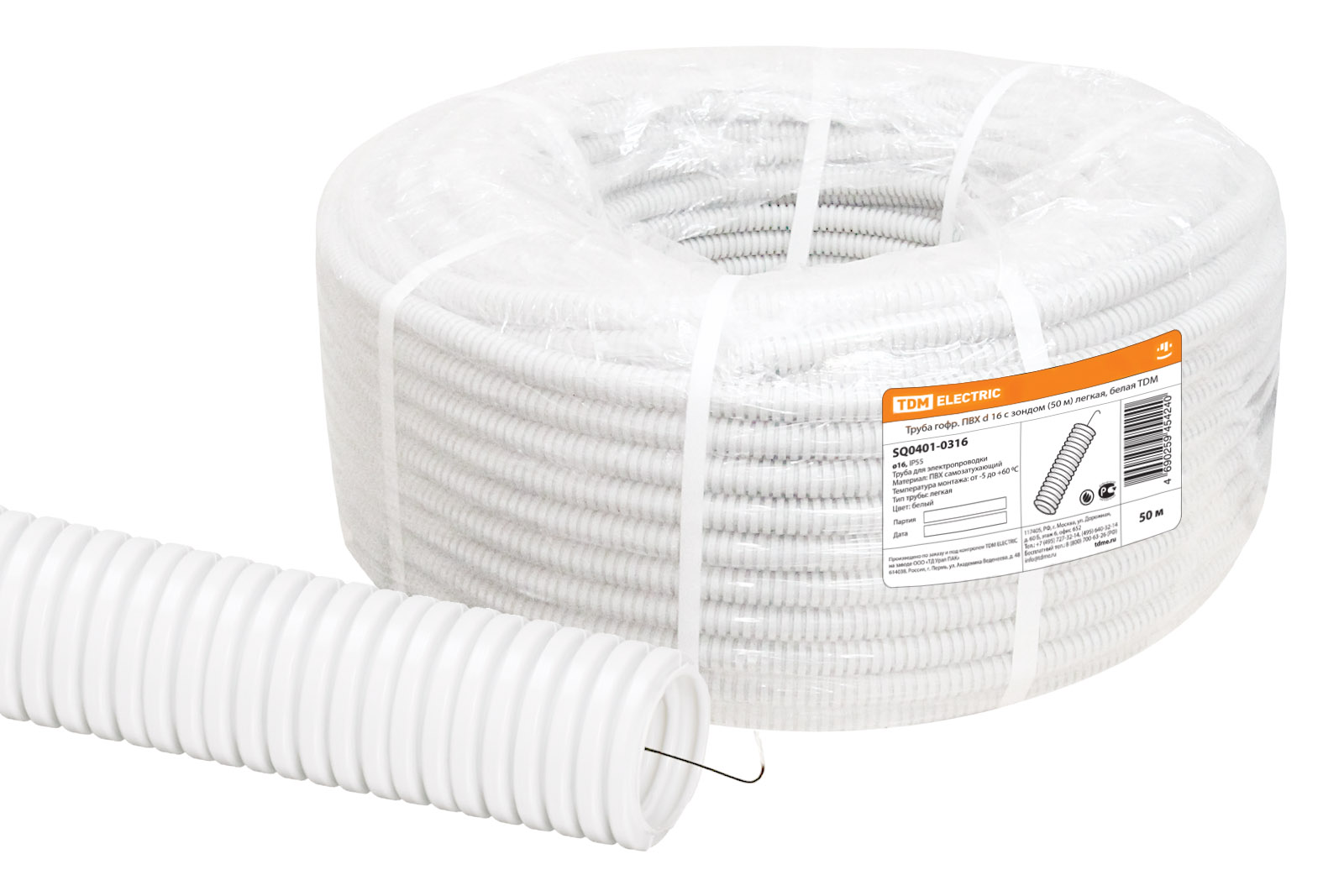 Наименование: Труба гофрированная ПВХ d 16 с зондом (50 м) легкая, белая TDM