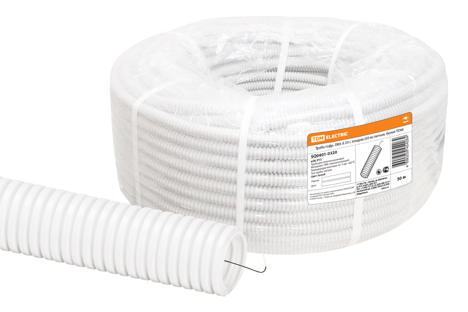 Наименование: Труба гофрированная ПВХ d 20 с зондом (50 м) легкая, белая TDM