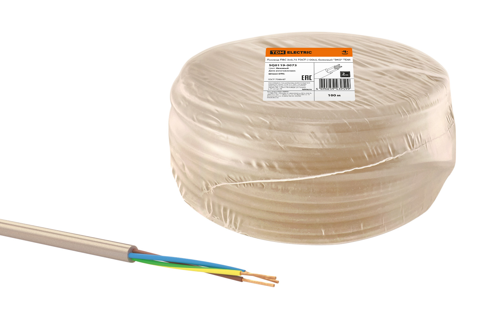 Наименование: Провод ПВС 3х0,75 ГОСТ (100м), бежевый "ЭКО" TDM