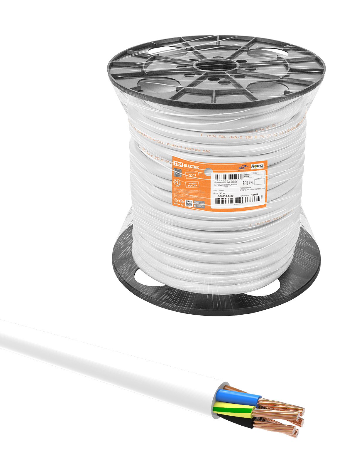 Наименование: Провод ПВС 5х2,5 ГОСТ на катушке (50м), белый TDM
