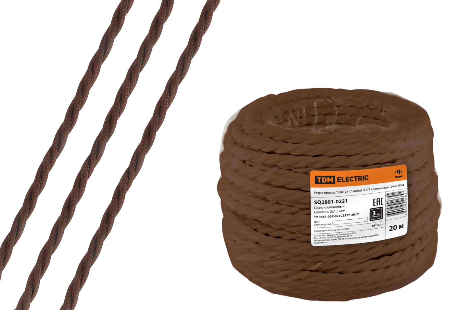Наименование: Ретро провод "Эко" 2х1,5 витой ГОСТ коричневый (20м) TDM